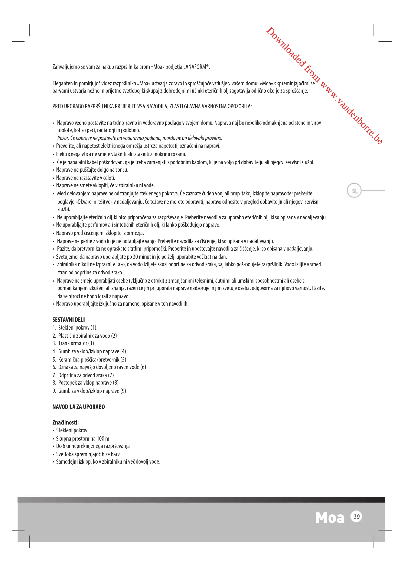 Zahvaljujemo se vam za nakup razpršilnika arom »Moa« podjetja LANAFORM®. Eleganten in pomirjujoč videz razpršilnika »Moa« ustvarja zdravo in sproščujoče vzdušje v vašem domu. »Moa« s spreminjajočimi se barvami ustvarja nežno in prijetno svetlobo, ki skupaj z dobrodejnimi učinki eteričnih olj zagotavlja odlično okolje za sproščanje. PRED UPORABO RAZPRŠILNIKA PREBERITE VSA NAVODILA, ZLASTI GLAVNA VARNOSTNA OPOZORILA: