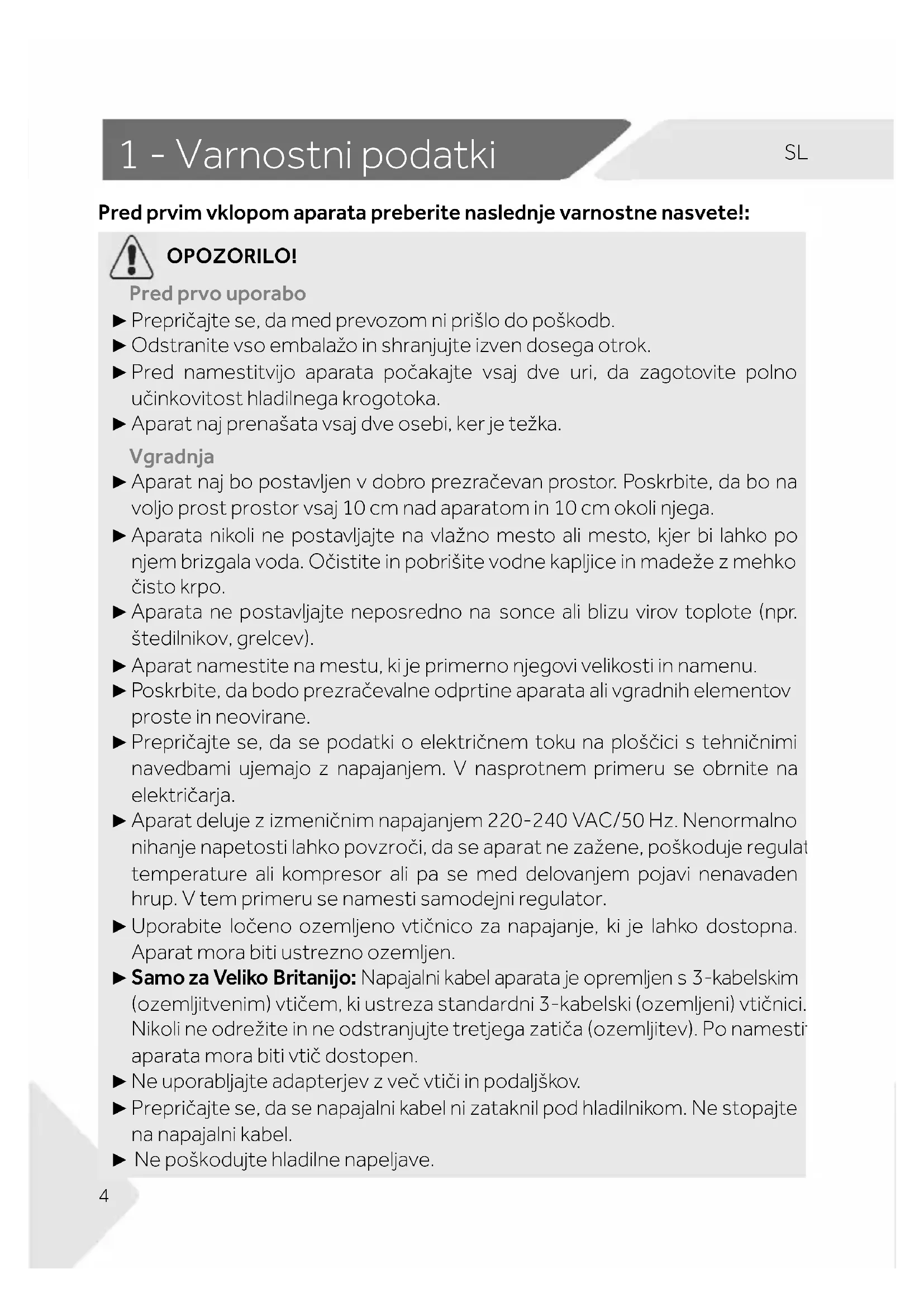 OPOZORILO! Pred prvo uporabo ► Prepričajte se, da med prevozom ni prišlo do poškodb. ► Odstranite vso embalažo in shranjujte izven dosega otrok. ► Pred namestitvijo aparata počakajte vsaj dve uri, da zagotovite polno učinkovitost hladilnega krogotoka. ► Aparat naj prenašata vsaj dve osebi, ker je težka. Vgradnja ► Aparat naj bo postavljen v dobro prezračevan prostor. Poskrbite, da bo na voljo prost prostor vsaj 10 cm nad aparatom in 10 cm okoli njega. ► Aparata nikoli ne postavljajte na vlažno mesto ali mesto, kjer bi lahko po njem brizgala voda. Očistite in pobrišite vodne kapljice in madeže z mehko čisto krpo. ► Aparata ne postavljajte neposredno na sonce ali blizu virov toplote (npr. štedilnikov, grelcev). ► Aparat namestite na mestu, ki je primerno njegovi velikosti in namenu. ► Poskrbite, da bodo prezračevalne odprtine aparata ali vgradnih elementov proste in neovirane. ► Prepričajte se, da se podatki o električnem toku na ploščici s tehničnimi navedbami ujemajo z napajanjem. V nasprotnem primeru se obrnite na električarja. ► Aparat deluje z izmeničnim napajanjem 220-240 VAC/50 Hz. Nenormalno nihanje napetosti lahko povzroči, da se aparat ne zažene, poškoduje regulator temperature ali kompresor ali pa se med delovanjem pojavi nenavaden hrup. V tem primeru se namesti samodejni regulator. ► Uporabite ločeno ozemljeno vtičnico za napajanje, ki je lahko dostopna. Aparat mora biti ustrezno ozemljen. ► Samo za Veliko Britanijo: Napajalni kabel aparata je opremljen s 3-kabelskim (ozemljitvenim) vtičem, ki ustreza standardni 3-kabelski (ozemljeni) vtičnici. Nikoli ne odrežite in ne odstranjujte tretjega zatiča (ozemljitev). Po namestitvi aparata mora biti vtič dostopen. ► Ne uporabljajte adapterjev z več vtiči in podaljškov. ► Prepričajte se, da se napajalni kabel ni zataknil pod hladilnikom. Ne stopajte na napajalni kabel. ► Ne poškodujte hladilne napeljave.5