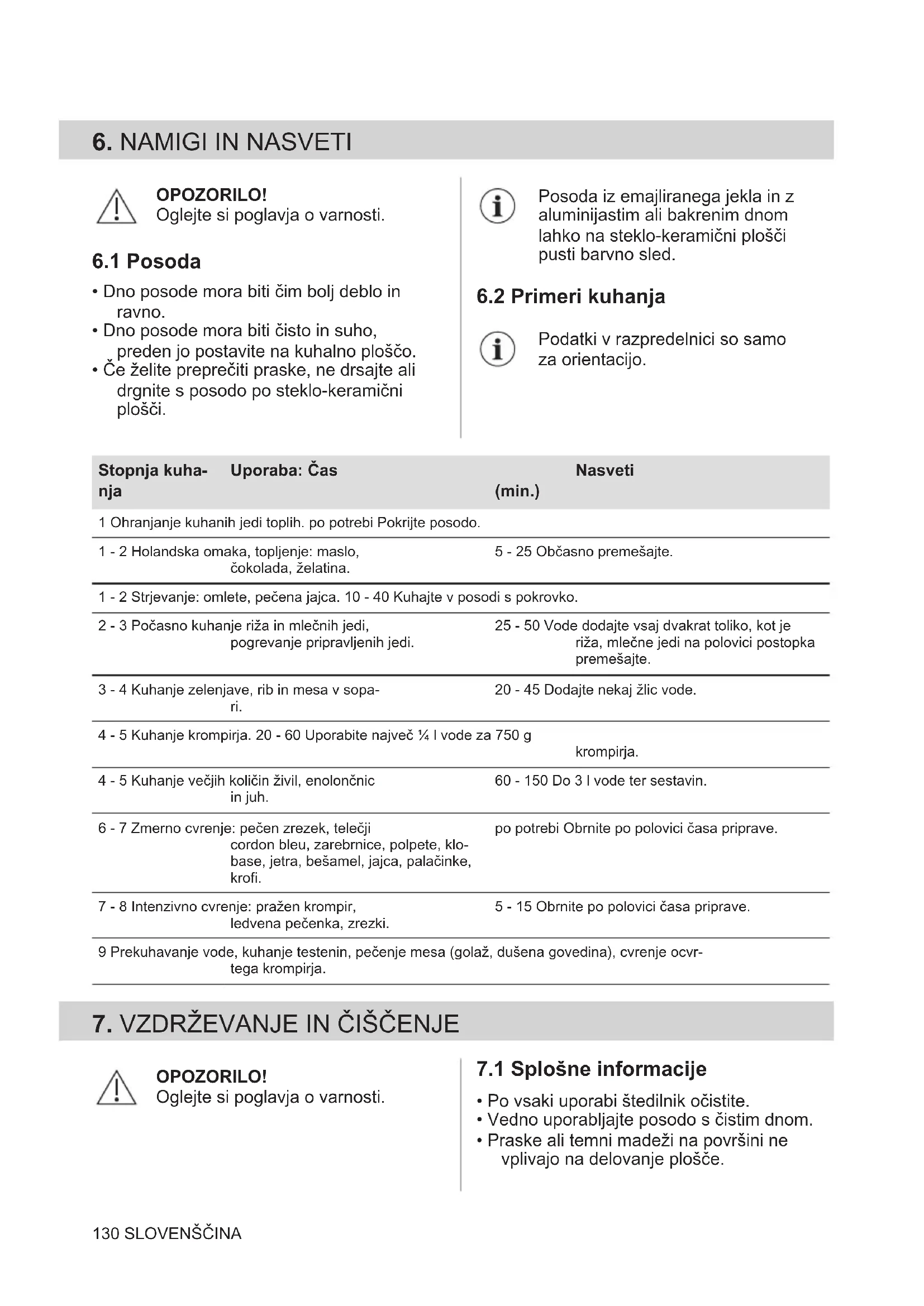 Podatki v razpredelnici so samo za orientacijo. Stopnja kuha‐ nja Uporaba: Čas (min.) Nasveti 1 Ohranjanje kuhanih jedi toplih. po potrebi Pokrijte posodo.