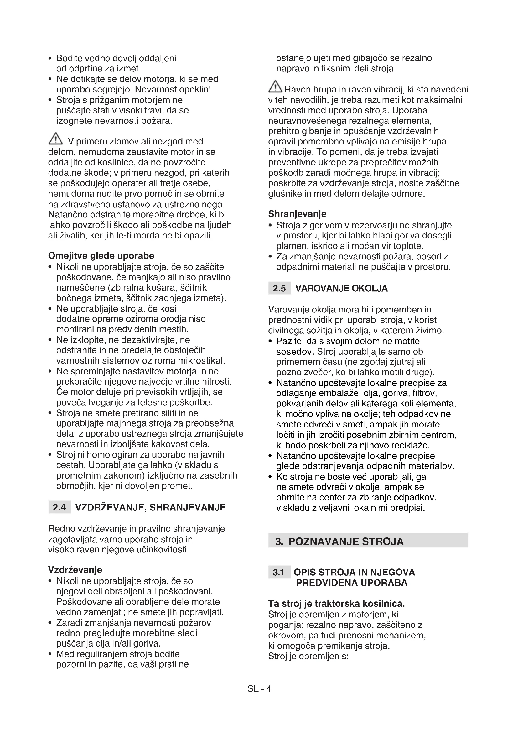 PREDVIDENA UPORABA Ta stroj je traktorska kosilnica. Stroj je opremljen z motorjem, ki poganja: rezalno napravo, zaščiteno z okrovom, pa tudi prenosni mehanizem, ki omogoča premikanje stroja. Stroj je opremljen s:SL - 5 – hidrostatičnim prenosom z variabilnimi brezstopenjskimi prestavnimi razmerji za vožnjo naprej in nazaj ("Hydro"), z dvokolesnim pogonom (2WD) ali štirikolesnim pogonom (4WD). Upravljavec lahko vodi stroj in upravlja glavne komande, pri tem pa se ves čas nahaja na sedežu za voznika. Na stroju montirane varnostne naprave omogočajo zaustavitev motorja in rezalne naprave v nekaj sekundah (odst. 6.2.2).