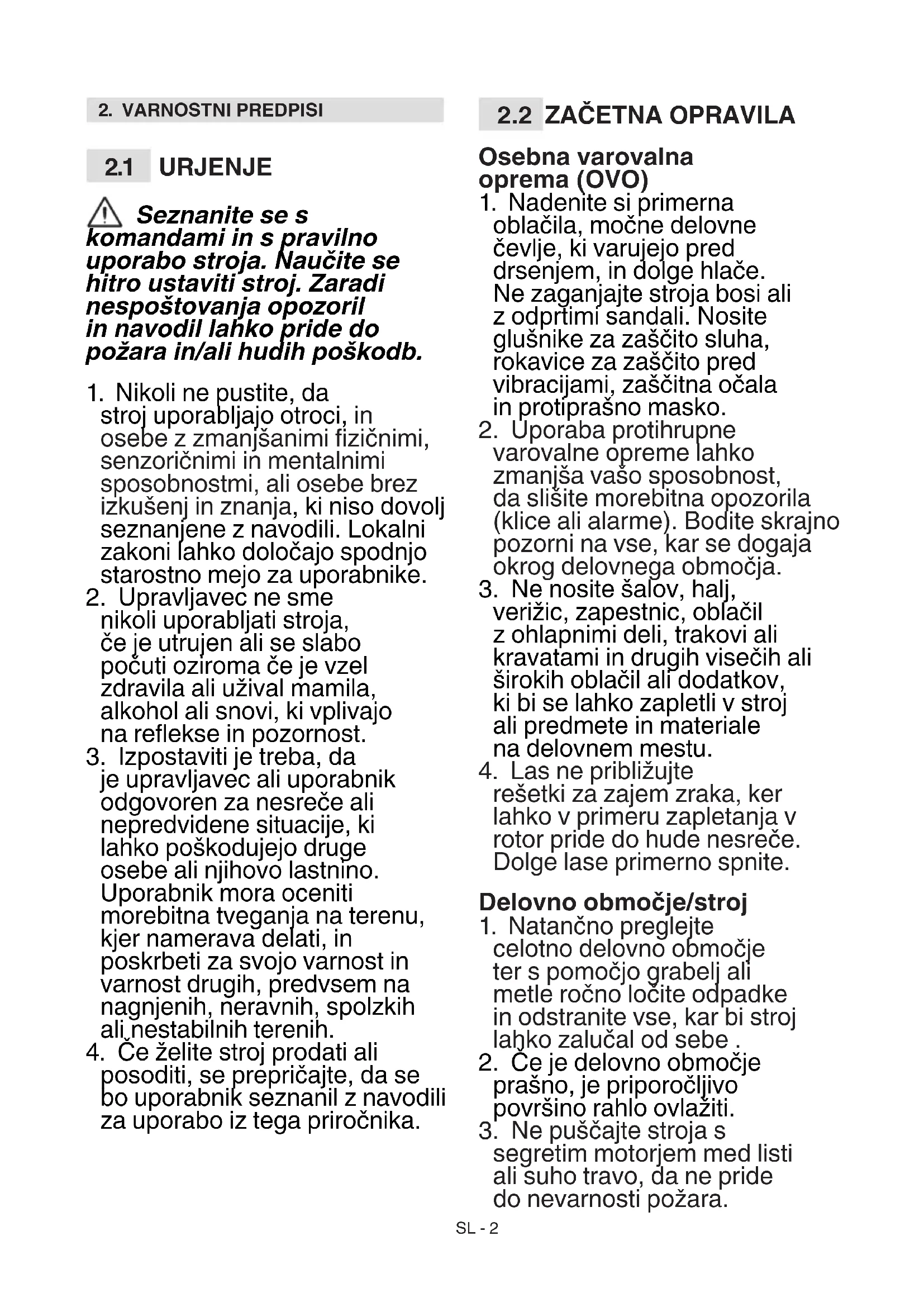 oblačila, močne delovne čevlje, ki varujejo pred drsenjem, in dolge hlače. Ne zaganjajte stroja bosi ali z odprtimi sandali. Nosite glušnike za zaščito sluha, rokavice za zaščito pred vibracijami, zaščitna očala in protiprašno masko.