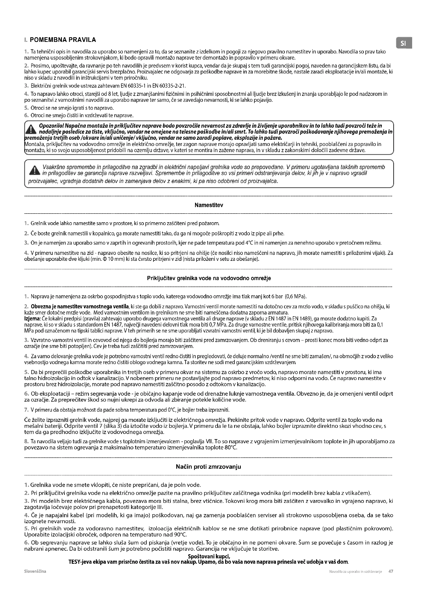 2. Pri priključitvi grelnika vode na električno omrežje pazite na pravilno priključitev zaščitnega vodnika (pri modelih brez kabla z vtikačem). 3. Pri modelih brez električnega kabla, povezava mora biti stalna, brez vtičnice. Tokovni krog mora biti zaščiten z varovalko in vgrajeno napravo, ki zagotavlja ločevaje polov pri prenapetosti kategorije III. 4. Če je napajalni kabel (pri modelih, ki ga imajo) poškodovan, naj ga zamenja pooblaščen serviser ali strokovno usposobljena oseba, da se tako izognete nevarnosti. 5. Pri grelnikih vode za vodoravno namestitev, izoloacija električnih kablov se ne sme dotikati prirobnice naprave (pod plastičnim pokrovom). Uporabite izolacijski obroček, odporen na temperaturo nad 90°C. 6. Ob segrevanju naprave se lahko sluša šum od piskanja (vretje vode). To je običajno in ne pomeni okvare. Šum se povečuje s časom in razlog je nabrani apnenec. Da bi odstranili šum je potrebno počistiti napravo. Garancija ne vključuje te storitve. Spoštovani kupci, TESY-jeva ekipa vam prisrčno čestita za vaš nov nakup. Upamo, da bo vaša nova naprava prinesla več udobja v vaš dom.48 Navodila za uporabo in vzdrževanje