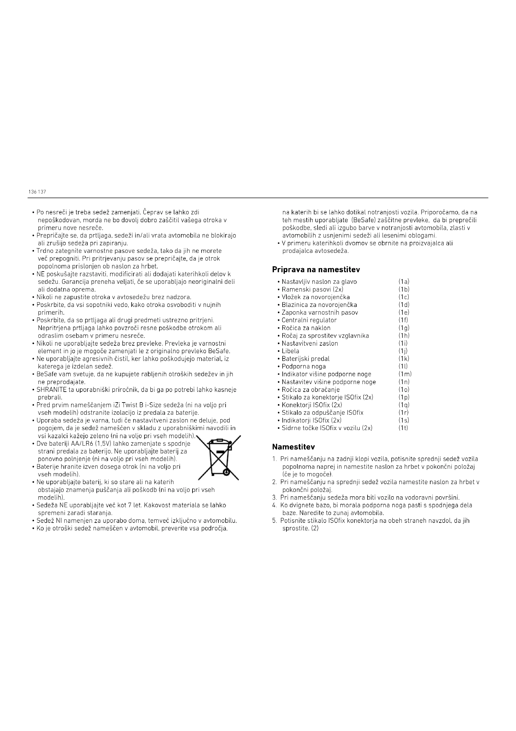 - Odstranite vložek za novorojenčke, ko otrok zraste več kot 87 cm. ! PRED namestitvijo sedeža, je pomembno prebrati ta uporabniška navodila. Nepravilna namestitev lahko ogrozi varnost vašega otroka. Hvala, ker ste izbrali BeSafe iZi Twist B i-Size136 137