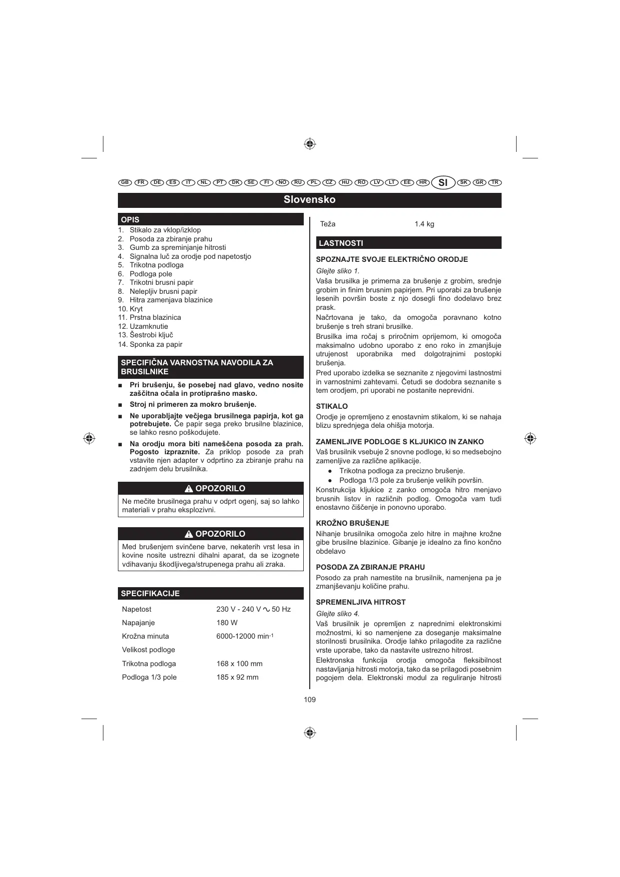 Nihajoe delovanje vaše brusilke povzroa zelo hitro krožno gibanje brusnega papirja. To gibanje je idealno za Âno brušenje. TECHNICKÉ ÚDAJE Napätie 230 V - 240 V Napájanie 180 W
