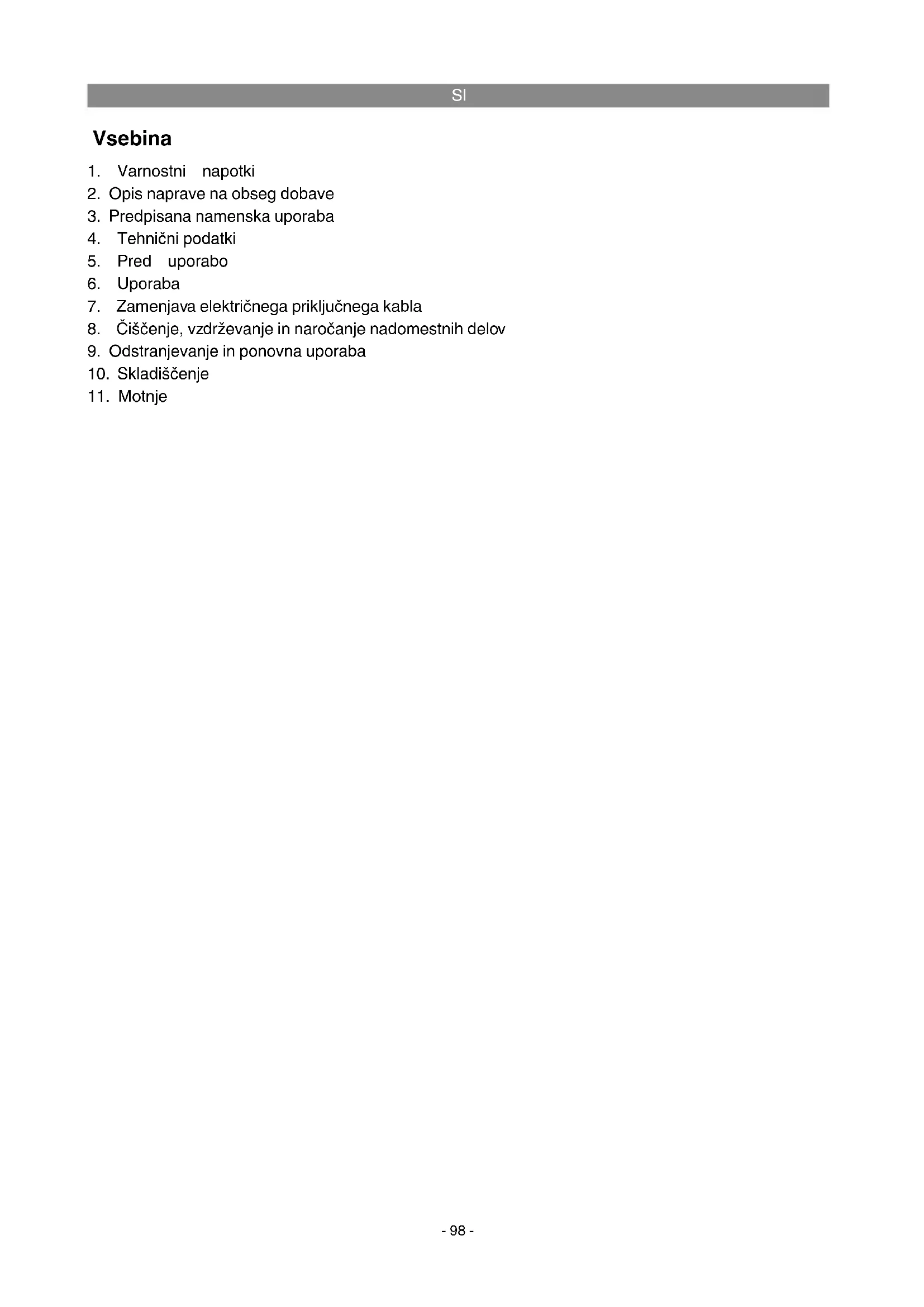 priključnega kabla Nevarnost! Če se električni priključni kabel te naprave poškoduje, ga mora zamenjati proizvajalec ali njegova servisna služba ali podobno strokovno usposobljena oseba, da bi preprečili ogrožanje varnosti.