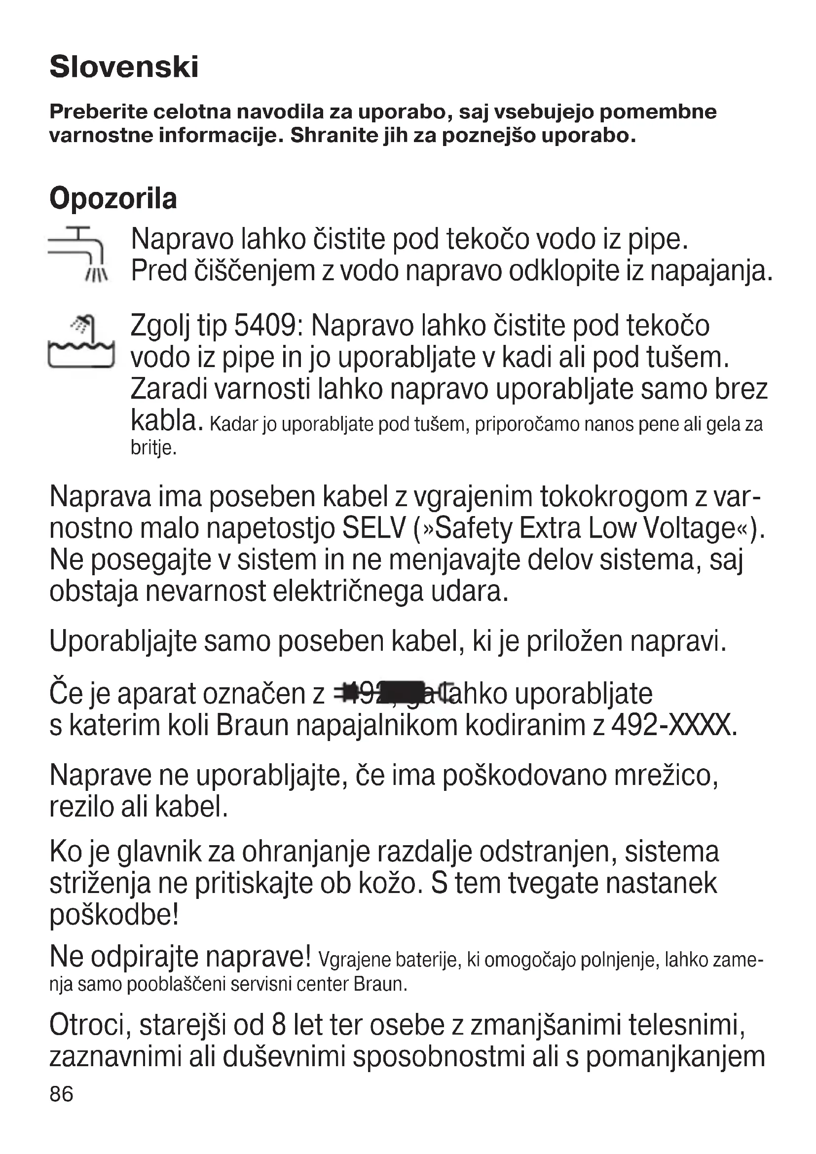 UL. 4. Gardijske brigade 43, Tel. 095 66 26 556 (u sklopu poslovnog prostora ROBOT COMMERCE d.o.o. (TTTS)) split@singuli.hr ili nazovite Call centar singuli: 072 700 707 91737906_Harmonia_3XX_310s_300s_BT_EURO_S6-136.indd 8591737906_Harmonia_3XX_310s_300s_BT_EURO_S6-136.indd 85 08.02.19 12:5708.02.19 12:57 Business Use - P&G AUTHORIZED POA-00106924 Rev 001 Effective Date 2019-02-14 Printed 2019-04-24 Page 85 of 13686 Preberite celotna navodila za uporabo, saj vsebujejo pomembne varnostne informacije. Shranite jih za poznejšo uporabo. Opozorila Napravo lahko čistite pod tekočo vodo iz pipe. Pred čiščenjem z vodo napravo odklopite iz napajanja. Zgolj tip 5409: Napravo lahko čistite pod tekočo vodo iz pipe in jo uporabljate v kadi ali pod tušem. Zaradi varnosti lahko napravo uporabljate samo brez kabla. Kadar jo uporabljate pod tušem, priporočamo nanos pene ali gela za britje. Naprava ima poseben kabel z vgrajenim tokokrogom z var- nostno malo napetostjo SELV (»Safety Extra Low Voltage«). Ne posegajte v sistem in ne menjavajte delov sistema, saj obstaja nevarnost električnega udara. Uporabljajte samo poseben kabel, ki je priložen napravi. Če je aparat označen z 492, ga lahko uporabljate s katerim koli Braun napajalnikom kodiranim z 492-XXXX. Naprave ne uporabljajte, če ima poškodovano mrežico, rezilo ali kabel. Ko je glavnik za ohranjanje razdalje odstranjen, sistema striženja ne pritiskajte ob kožo. S tem tvegate nastanek poškodbe! Ne odpirajte naprave! Vgrajene baterije, ki omogočajo polnjenje, lahko zame- nja samo pooblaščeni servisni center Braun. Otroci, starejši od 8 let ter osebe z zmanjšanimi telesnimi, zaznavnimi ali duševnimi sposobnostmi ali s pomanjkanjem Slovenski 91737906_Harmonia_3XX_310s_300s_BT_EURO_S6-136.indd 8691737906_Harmonia_3XX_310s_300s_BT_EURO_S6-136.indd 86 08.02.19 12:5708.02.19 12:57 Business Use - P&G AUTHORIZED POA-00106924 Rev 001 Effective Date 2019-02-14 Printed 2019-04-24 Page 86 of 13687 izkušenj in znanja lahko to napravo uporabljajo pod nadzo- rom, ali če so bili poučeni o varni uporabi naprave in razu- mejo nevarnosti, ki izhajajo iz njene uporabe. Otroci se z napravo ne smejo igrati. Otroci naprave ne smejo čistiti in vzdrževati. Iz higienskih razlogov si aparata ne menjajte z drugimi osebami. Opis 1 Kaseta z rezalnikom in mrežico 2 Gumb za vklop/izklop 3 Indikator prazne baterije 4 Vtičnica brivnika 5 Poseben kabel (oblika je lahko drugačna) 6 Strižnik za brado s 5 nastavki * (glejte slike) 7 Zaščitni nastavek* 8 Potovalna torbica*