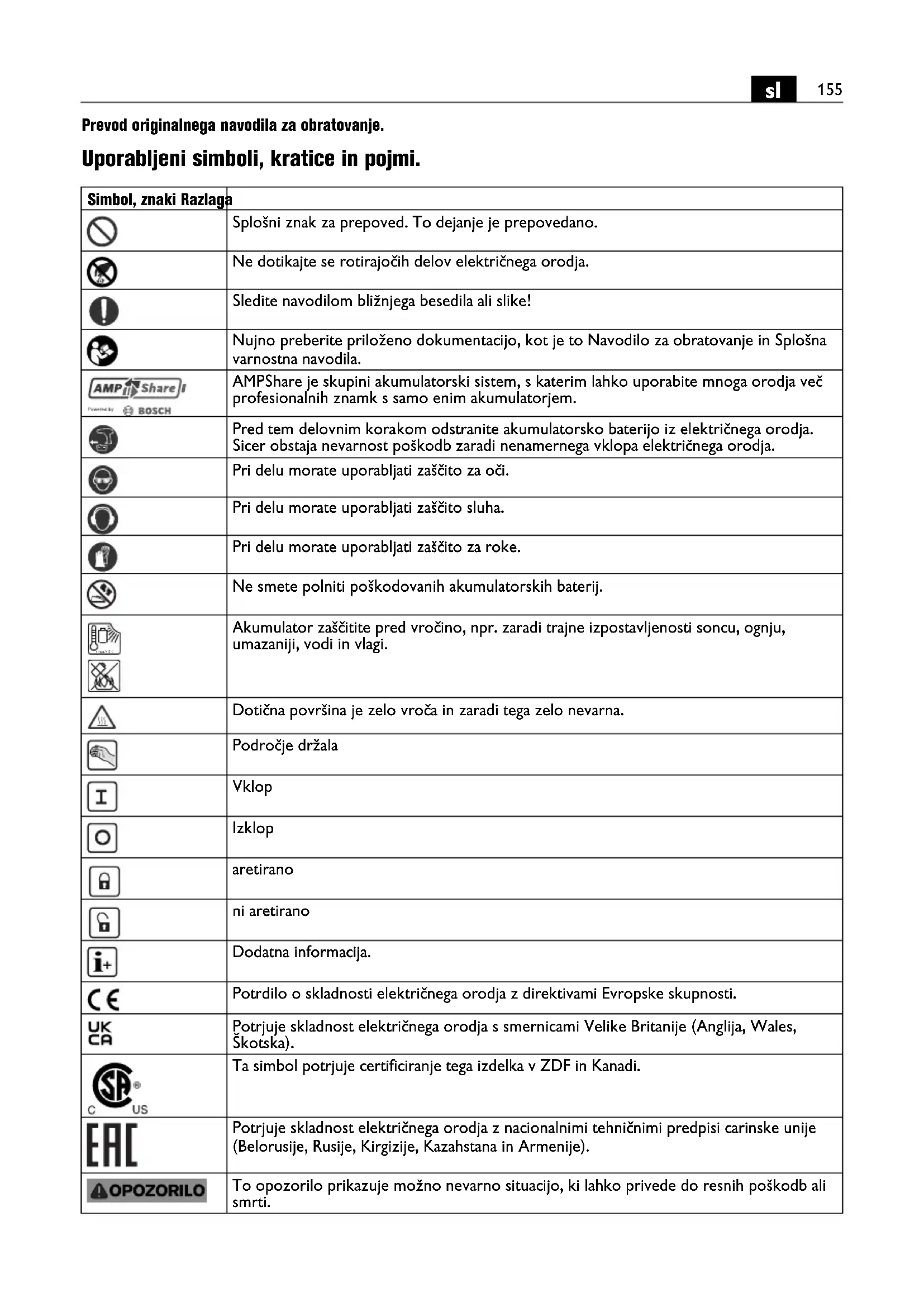 Prevod originalnega navodila za obratovanje. Uporabljeni simboli, kratice in pojmi. Simbol, znaki Razlaga Splošni znak za prepoved. To dejanje je prepovedano. Ne dotikajte se rotirajočih delov električnega orodja. Sledite navodilom bližnjega besedila ali slike! Nujno preberite priloženo dokumentacijo, kot je to Navodilo za obratovanje in Splošna varnostna navodila. AMPShare je skupini akumulatorski sistem, s katerim lahko uporabite mnoga orodja več profesionalnih znamk s samo enim akumulatorjem. Pred tem delovnim korakom odstranite akumulatorsko baterijo iz električnega orodja. Sicer obstaja nevarnost poškodb zaradi nenamernega vklopa električnega orodja. Pri delu morate uporabljati zaščito za oči. Pri delu morate uporabljati zaščito sluha. Pri delu morate uporabljati zaščito za roke. Ne smete polniti poškodovanih akumulatorskih baterij. Akumulator zaščitite pred vročino, npr. zaradi trajne izpostavljenosti soncu, ognju, umazaniji, vodi in vlagi. Dotična površina je zelo vroča in zaradi tega zelo nevarna. Področje držala Vklop Izklop aretirano ni aretirano Dodatna informacija. Potrdilo o skladnosti električnega orodja z direktivami Evropske skupnosti. Potrjuje skladnost električnega orodja s smernicami Velike Britanije (Anglija, Wales, Škotska). Ta simbol potrjuje certificiranje tega izdelka v ZDF in Kanadi. Potrjuje skladnost električnega orodja z nacionalnimi tehničnimi predpisi carinske unije (Belorusije, Rusije, Kirgizije, Kazahstana in Armenije). To opozorilo prikazuje možno nevarno situacijo, ki lahko privede do resnih poškodb ali smrti. max.50°C156