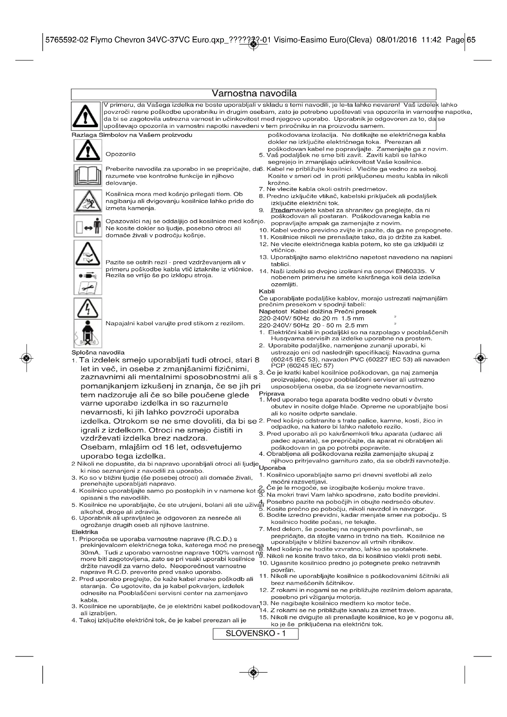 Pozor! Firma Husqvarna UK Ltd. nepřijímá zodpovědnost podle této záruky za vady způsobené zcela nebo částečně, přímo nebo nepřímo instalací nebo výměnou částí nebo instalací dodatečných částí, které nejsou vyrobeny nebo schváleny firmou Husqvarna UK Ltd. a nebo pokud bylo zařízení jakýmkoli způsobem modifikováno. 5765592-02 Flymo Chevron 34VC-37VC Euro.qxp_???????-01 Visimo-Easimo Euro(Cleva) 08/01/2016 11:42 Page 64Varnostna navodila V primeru, da Vašega izdelka ne boste uporabljali v skladu s temi navodili, je le-ta lahko nevaren! Vaš izdelek lahko povzroči resne poškodbe uporabniku in drugim osebam, zato je potrebno upoštevati vsa opozorila in varnostne napotke, da bi se zagotovila ustrezna varnost in učinkovitost med njegovo uporabo. Uporabnik je odgovoren za to, da se upoštevajo opozorila in varnostni napotki navedeni v tem priročniku in na proizvodu samem. Razlaga Simbolov na Vašem proizvodu Opozorilo Preberite navodila za uporabo in se prepričajte, da razumete vse kontrolne funkcije in njihovo delovanje. Kosilnica mora med košnjo prilegati tlem. Ob nagibanju ali dvigovanju kosilnice lahko pride do izmeta kamenja. Opazovalci naj se oddaljijo od kosilnice med košnjo. Ne kosite dokler so ljudje, posebno otroci ali domače živali v področju košnje. Pazite se ostrih rezil - pred vzdrževanjem ali v primeru poškodbe kabla vtič iztaknite iz vtičnice. Rezila se vrtijo še po izklopu stroja. Napajalni kabel varujte pred stikom z rezilom. Splošna navodila