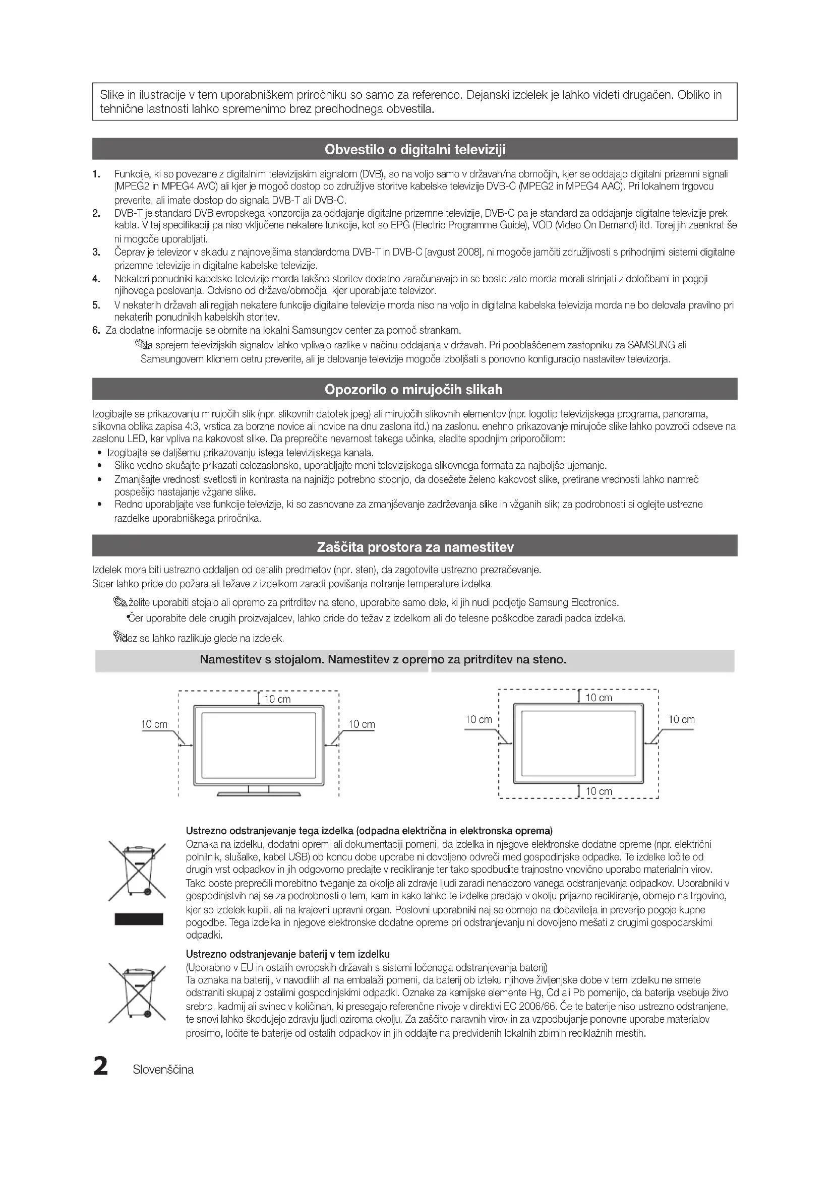 Videz se lahko razlikuje glede na izdelek. Namestitev s stojalom. Namestitev z opremo za pritrditev na steno. 10 cm 10 cm 10 cm 10 cm 10 cm 10 cm 10 cm Ustrezno odstranjevanje tega izdelka (odpadna električna in elektronska oprema) Oznaka na izdelku, dodatni opremi ali dokumentaciji pomeni, da izdelka in njegove elektronske dodatne opreme (npr. električni polnilnik, slušalke, kabel USB) ob koncu dobe uporabe ni dovoljeno odvreči med gospodinjske odpadke. Te izdelke ločite od drugih vrst odpadkov in jih odgovorno predajte v recikliranje ter tako spodbudite trajnostno vnovično uporabo materialnih virov. Tako boste preprečili morebitno tveganje za okolje ali zdravje ljudi zaradi nenadzoro vanega odstranjevanja odpadkov. Uporabniki v gospodinjstvih naj se za podrobnosti o tem, kam in kako lahko te izdelke predajo v okolju prijazno recikliranje, obrnejo na trgovino, kjer so izdelek kupili, ali na krajevni upravni organ. Poslovni uporabniki naj se obrnejo na dobavitelja in preverijo pogoje kupne pogodbe. Tega izdelka in njegove elektronske dodatne opreme pri odstranjevanju ni dovoljeno mešati z drugimi gospodarskimi odpadki. Ustrezno odstranjevanje baterij v tem izdelku (Uporabno v EU in ostalih evropskih državah s sistemi ločenega odstranjevanja baterij) Ta oznaka na bateriji, v navodilih ali na embalaži pomeni, da baterij ob izteku njihove življenjske dobe v tem izdelku ne smete odstraniti skupaj z ostalimi gospodinjskimi odpadki. Oznake za kemijske elemente Hg, Cd ali Pb pomenijo, da baterija vsebuje živo srebro, kadmij ali svinec v količinah, ki presegajo referenčne nivoje v direktivi EC 2006/66. Če te baterije niso ustrezno odstranjene, te snovi lahko škodujejo zdravju ljudi oziroma okolju. Za zaščito naravnih virov in za vzpodbujanje ponovne uporabe materialov prosimo, ločite te baterije od ostalih odpadkov in jih oddajte na predvidenih lokalnih zbirnih reciklažnih mestih. [UC8000]BN68-02697A-XC.indb 2 2010-03-16 오후 5:10:133 SLOVENŠČINA Slovenščina Kazalo Začetek uporabe
