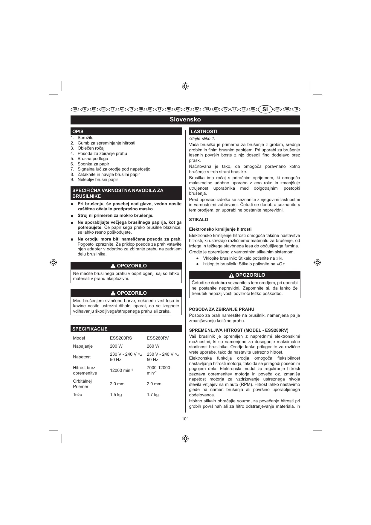 SPREMENLJIVA HITROST (MODEL - ESS280RV) Vaš brusilnik je opremljen z naprednimi elektronskimi možnostmi, ki so namenjene za doseganje maksimalne storilnosti brusilnika. Orodje lahko prilagodite za razline vrste uporabe, tako da nastavite ustrezno hitrost. Elektronska funkcija orodja omogoa Åeksibilnost nastavljanja hitrosti motorja, tako da se prilagodi posebnim pogojem dela. Elektronski modul za reguliranje hitrosti zaznava obremenitev motorja in povea oz. zmanjša napetost motorja za vzdrževanje ustreznega nivoja števila vrtljajev na minuto (RPM). Hitrost lahko nastavimo glede na namen brušenja ali površino uporabljenega obdelovanca. Izbirno stikalo obraajte sourno, za poveanje hitrosti pri grobih površinah ali za hitro odstranjevanje materiala, in