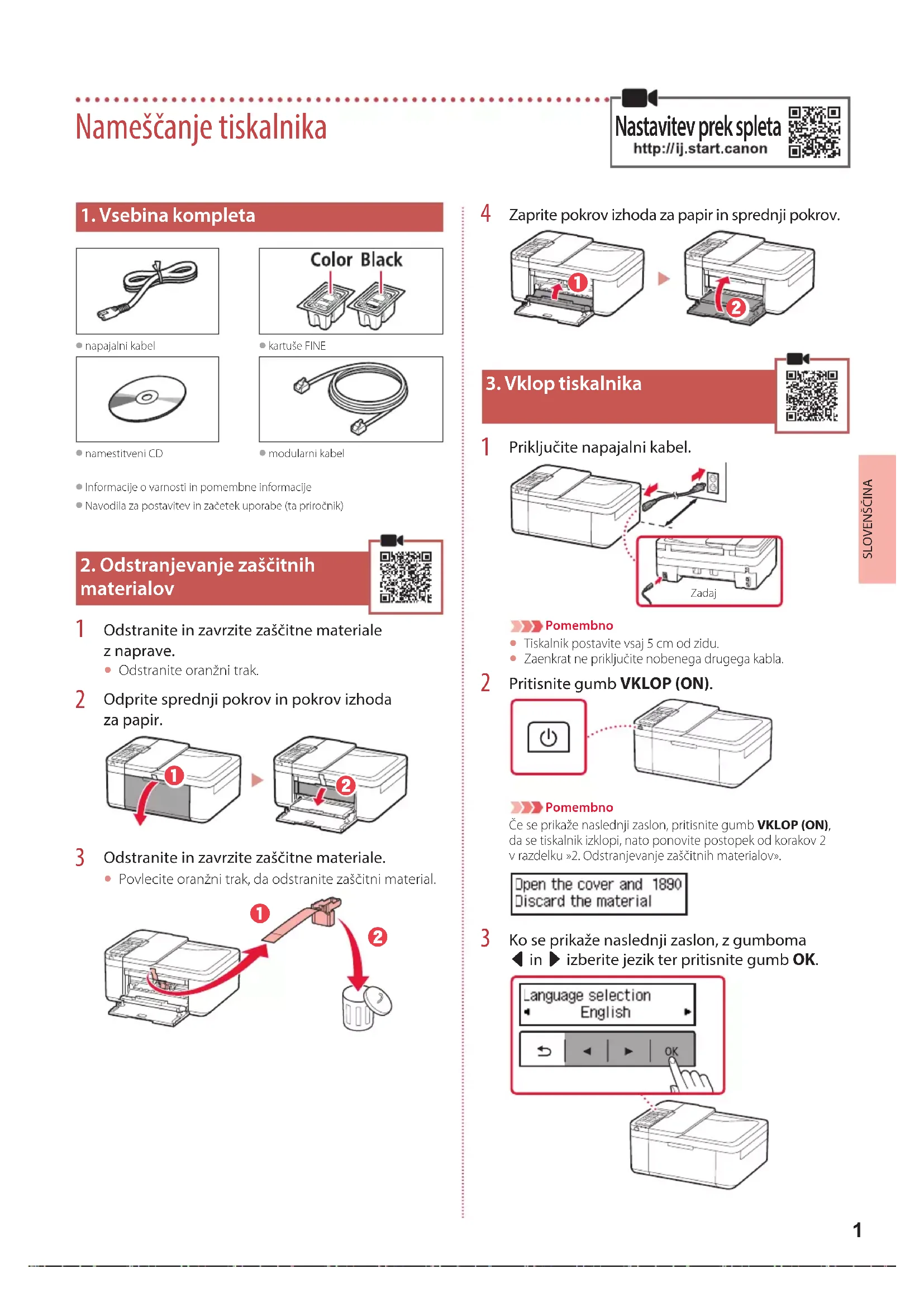 Priključite napajalni kabel. Zadaj Pomembno Tiskalnik postavite vsaj 5 cm od zidu. Zaenkrat ne priključite nobenega drugega kabla. Pritisnite gumb VKLOP (ON). PomembnoČe se prikaže naslednji zaslon, pritisnite gumb VKLOP (ON), dase tiskalnik izklopi, nato ponovite postopek od korakov 2 vrazdelku »2. Odstranjevanje zaščitnih materialov». Ko se prikaže naslednji zaslon, z gumboma [ in ] izberite jezik ter pritisnite gumb OK. Nameščanje tiskalnika Nastavitev prek spleta2 Nameščanje tiskalnika