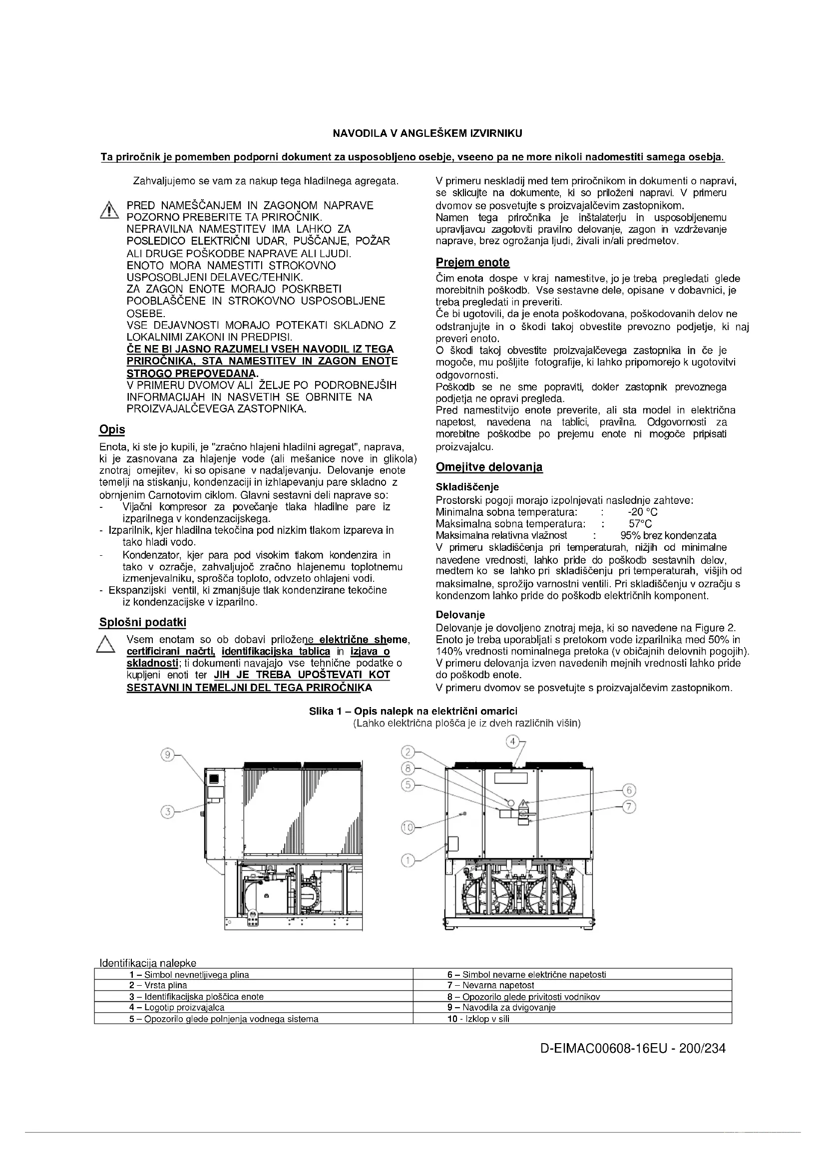 PROIZVAJALČEVEGA ZASTOPNIKA. Opis Enota, ki ste jo kupili, je "zračno hlajeni hladilni agregat", naprava, ki je zasnovana za hlajenje vode (ali mešanice nove in glikola) znotraj omejitev, ki so opisane v nadaljevanju. Delovanje enote temelji na stiskanju, kondenzaciji in izhlapevanju pare skladno z obrnjenim Carnotovim ciklom. Glavni sestavni deli naprave so: - Vijačni kompresor za povečanje tlaka hladilne pare iz izparilnega v kondenzacijskega. - Izparilnik, kjer hladilna tekočina pod nizkim tlakom izpareva in tako hladi vodo. - Kondenzator, kjer para pod visokim tlakom kondenzira in tako v ozračje, zahvaljujoč zračno hlajenemu toplotnemu izmenjevalniku, sprošča toploto, odvzeto ohlajeni vodi. - Ekspanzijski ventil, ki zmanjšuje tlak kondenzirane tekočine iz kondenzacijske v izparilno. Splošni podatki Vsem enotam so ob dobavi priložene električne sheme, certificirani načrti, identifikacijska tablica in izjava o skladnosti; ti dokumenti navajajo vse tehnične podatke o kupljeni enoti ter JIH JE TREBA UPOŠTEVATI KOT SESTAVNI IN TEMELJNI DEL TEGA PRIROČNIKA V primeru neskladij med tem priročnikom in dokumenti o napravi, se sklicujte na dokumente, ki so priloženi napravi. V primeru dvomov se posvetujte s proizvajalčevim zastopnikom. Namen tega priročnika je inštalaterju in usposobljenemu upravljavcu zagotoviti pravilno delovanje, zagon in vzdrževanje naprave, brez ogrožanja ljudi, živali in/ali predmetov. Prejem enote Čim enota dospe v kraj namestitve, jo je treba pregledati glede morebitnih poškodb. Vse sestavne dele, opisane v dobavnici, je treba pregledati in preveriti. Če bi ugotovili, da je enota poškodovana, poškodovanih delov ne odstranjujte in o škodi takoj obvestite prevozno podjetje, ki naj preveri enoto. O škodi takoj obvestite proizvajalčevega zastopnika in če je mogoče, mu pošljite fotografije, ki lahko pripomorejo k ugotovitvi odgovornosti. Poškodb se ne sme popraviti, dokler zastopnik prevoznega podjetja ne opravi pregleda. Pred namestitvijo enote preverite, ali sta model in električna napetost, navedena na tablici, pravilna. Odgovornosti za morebitne poškodbe po prejemu enote ni mogoče pripisati proizvajalcu. Omejitve delovanja Skladiščenje Prostorski pogoji morajo izpolnjevati naslednje zahteve: Minimalna sobna temperatura: : -20 °C Maksimalna sobna temperatura: : 57°C Maksimalna relativna vlažnost : 95% brez kondenzata V primeru skladiščenja pri temperaturah, nižjih od minimalne navedene vrednosti, lahko pride do poškodb sestavnih delov, medtem ko se lahko pri skladiščenju pri temperaturah, višjih od maksimalne, sprožijo varnostni ventili. Pri skladiščenju v ozračju s kondenzom lahko pride do poškodb električnih komponent. Delovanje Delovanje je dovoljeno znotraj meja, ki so navedene na Figure 2. Enoto je treba uporabljati s pretokom vode izparilnika med 50% in 140% vrednosti nominalnega pretoka (v običajnih delovnih pogojih). V primeru delovanja izven navedenih mejnih vrednosti lahko pride do poškodb enote. V primeru dvomov se posvetujte s proizvajalčevim zastopnikom. Slika 1 – Opis nalepk na električni omarici (Lahko električna plošča je iz dveh različnih višin)
