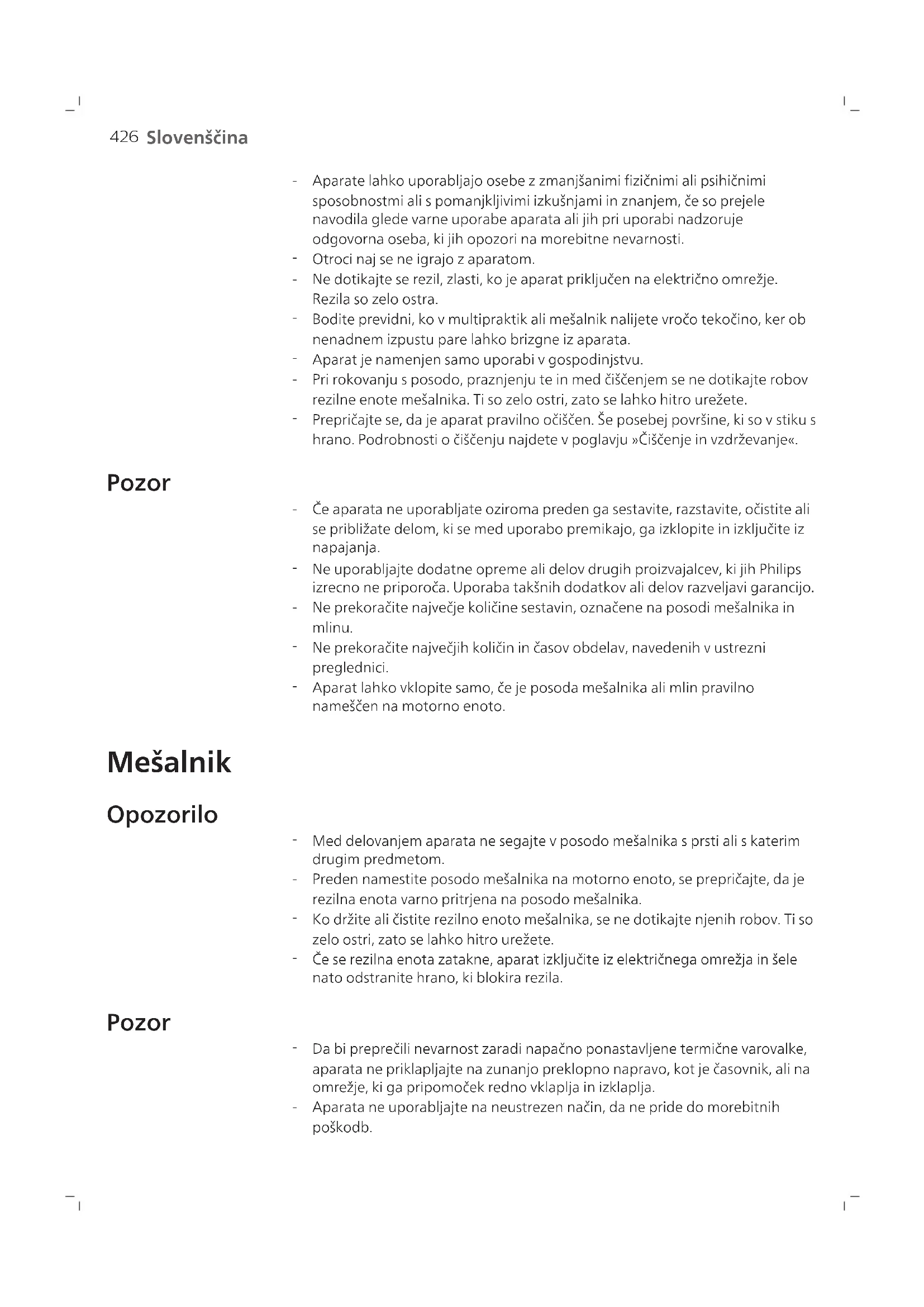 Po posamezni obdelavi počakajte, da se aparat ohladi na sobno temperaturo. Da bo hrana ostala sveža, je ne shranjujte zelo dolgo v posodi. Elektromagnetna polja (EMF) Ta aparat ustreza veljavnim standardom in predpisom glede izpostavljenosti elektromagnetnim poljem. Recikliranje Ta simbol pomeni, da izdelka ne smete odlagati skupaj z običajnimi gospodinjskimi odpadki (2012/19/EU). Upoštevajte državne predpise za ločeno zbiranje električnih in elektronskih izdelkov. S pravilnim odlaganjem pripomorete k preprečevanju negativnih vplivov na okolje in zdravje ljudi. Ves embalažni material v škatli je izdelan iz recikliranega papirja, razen če je navedeno drugače. Oglejte si oznako PAP na škatli. Garancija in podpora Versuni za ta izdelek nudi dveletno garancijo po nakupu. Ta garancija ne velja, če je okvara posledica nepravilne uporabe ali slabega vzdrževanja. Naša garancija ne vpliva na vaše pravice, ki jih imate kot potrošnik v skladu z zakonodajo. Za več informacij ali za uveljavljanje garancije obiščite naše spletno mesto www.philips.com/support.429 Slovenščina Pred prvo uporabo Pred prvo uporabo aparat in dodatke očistite s toplo milnico. Preden ga sestavite, aparat temeljito sperite in popolnoma osušite. Mešalnik postavite na stabilno in ravno površino. Ne postavljajte ga v bližino virov toplote, vode ali vnetljivih materialov. Uporaba aparata 1 Na rezilno enoto mešalnika postavite tesnilni obroček. 2 Rezilno enoto obrnite v nasprotni smeri urnega kazalca, da se zaskoči na posodo mešalnika. 3 Sestavljeno posodo mešalnika obrnite v smeri urnega kazalca, da se zaskoči na motorno enoto. Ko se ustrezno zaskoči, boste zaslišali klik. 4 V posodo mešalnika dodajte sestavine. Ne prekoračite največje količine sestavin na posodi mešalnika. 5 Merilno posodico pritrdite v pokrov posode mešalnika in pokrov zaprite.430 Slovenščina 6 Aparat priključite v električno omrežje. 7 Regulator premaknite na želeno hitrost. Začnite z najnižjo hitrostjo in jo po potrebi povečajte. Za pulzni način obrnite regulator na pulzno nastavitev. OFF 8 Regulator obrnite na hitrost 0, da aparat izklopite. 9 Aparat izključite iz električnega omrežja.431 Slovenščina 10 Izpraznite posodo mešalnika in uživajte. Uporaba potiskala MAX 600g 1 V posodo mešalnika dodajte sestavine. V posodo mešalnika ne dajajte več kot 600g (približno polovico posode) sestavin. 2 Merilno posodico pritrdite v pokrov posode mešalnika in pokrov zaprite. 3 Aparat priključite v električno omrežje. ~ 6 x P 4 Regulator večkrat obrnite na pulzno nastavitev.432 Slovenščina 5 Odstranite merilno posodico iz pokrova posode mešalnika. 6 Vstavite potiskalo, s katerim nežno mešate in pritiskate navzdol. 7 Regulator obrnite na hitrost 3. 8 S potiskalom mešajte in potiskajte. OFF 9 Regulator obrnite na hitrost 0, da aparat izklopite.433 Slovenščina 10 Aparat izključite iz električnega omrežja. 11 Postrezite in uživajte. Uporaba sekljalnika 1 Sklopno enoto obrnite v nasprotni smeri urnega kazalca, da se zaskoči na posodo sekljalnika. 2 Sestavljeno posodo sekljalnika obrnite v smeri urnega kazalca, da se zaskoči na motorno enoto. Ko se ustrezno zaskoči, boste zaslišali klik. 3 Rezilno enoto sekljalnika namestite na gred posode sekljalnika.434 Slovenščina 4 V posodo sekljalnika dodajte sestavine. Ne prekoračite največje količine sestavin na posodi sekljalnika. 5 Pokrov posode sekljalnika obrnite v smeri urnega kazalca, da se zaskoči na posodo sekljalnika. 6 Aparat priključite v električno omrežje. 7 Regulator premaknite na želeno hitrost. OFF 8 Regulator obrnite na hitrost 0, da aparat izklopite.435 Slovenščina 9 Aparat izključite iz električnega omrežja. 10 Posodo sekljalnika obrnite v nasprotni smeri urnega kazalca, da jo odstranite iz motorne enote. 11 Rezilno enoto sekljalnika in pokrov odstranite s posode sekljalnika. 12 Obdelane sestavine izlijte. Uporaba mlina 1 V vrč dodajte sestavine. Ne prekoračite maksimalne količine na vrču.436 Slovenščina 2 Rezilno enoto mlina obrnite v nasprotni smeri urnega kazalca, da se zaskoči na vrč. 3 Sestavljeni vrč obrnite v smeri urnega kazalca, da se zaskoči na motorno enoto. Ko se varno zaskoči, boste zaslišali klik. 4 Aparat priključite v električno omrežje. 5 Regulator premaknite na želeno hitrost. OFF 6 Regulator obrnite na hitrost 0, da aparat izklopite.437 Slovenščina 7 Aparat izključite iz električnega omrežja. 8 Vrč obrnite v nasprotni smeri urnega kazalca, da ga odstranite iz motorne enote. 9 Rezilno enoto mlina obrnite v smeri urnega kazalca, da jo odstranite z vrča. 10 Obdelane sestavine izlijte. Uporaba mlinčka 1 V posodo mlinčka dodajte sestavine. Ne presezite največje količine na posodi.438 Slovenščina 2 Pokrov posode mlinčka obrnite v smeri urnega kazalca, da se zaskoči na posodo mlinčka. Ko se ustrezno zaskoči, boste zaslišali klik. 3 Posodo mlinčka pritrdite na motorno enoto. 4 Sestavljeno posodo mlinčka obrnite v smeri urnega kazalca, da se zaskoči. Ko se ustrezno zaskoči, boste zaslišali klik. 5 Aparat priključite v električno omrežje. 6 Regulator obrnite na hitrost 3.439 Slovenščina OFF 7 Regulator obrnite na hitrost 0, da aparat izklopite. 8 Aparat izključite iz električnega omrežja. 9 Posodo mlinčka obrnite v nasprotni smeri urnega kazalca, da jo odstranite iz motorne enote. 10 Pokrov posode mlinčka obrnite v nasprotni smeri urnega kazalca, da ga odstranite s posode. 11 Obdelane sestavine izlijte.440 Slovenščina Uporaba lončka 1 V lonček dodajte sestavine. Ne prekoračite največje količine sestavin na lončku. 2 Na rezilno enoto previdno pritrdite tesnilni obroček. 3 Tesnilni obroček trdno pritisnite na njegovo mesto. Pazite, da se ne poškodujete na rezilu. 4 Rezilno enoto obrnite v smeri urnega kazalca, da se zaskoči na lonček. 5 Sestavljen lonček obrnite v smeri urnega kazalca, da se zaskoči na motorno enoto. Ko se ustrezno zaskoči, boste zasli