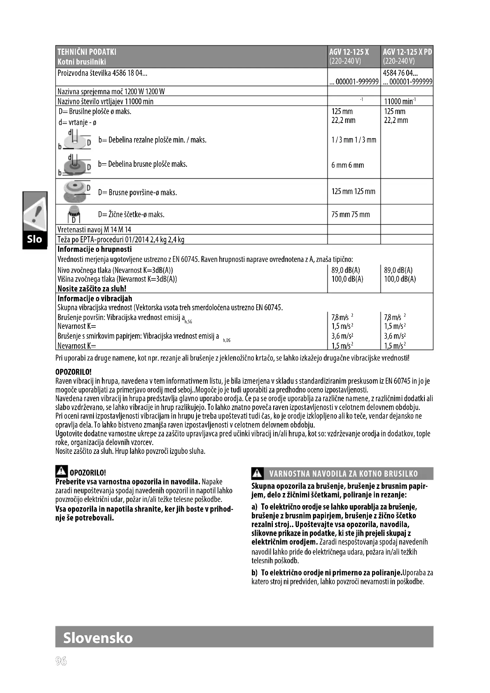 Pri uporabi za druge namene, kot npr. rezanje ali brušenje z jeklenožično krtačo, se lahko izkažejo drugačne vibracijske vrednosti! OPOZORILO! Raven vibracij in hrupa, navedena v tem informativnem listu, je bila izmerjena v skladu s standardiziranim preskusom iz EN 60745 in jo je mogoče uporabljati za primerjavo orodij med seboj..Mogoče jo je tudi uporabiti za predhodno oceno izpostavljenosti. Navedena raven vibracij in hrupa predstavlja glavno uporabo orodja. Če pa se orodje uporablja za različne namene, z različnimi dodatki ali slabo vzdrževano, se lahko vibracije in hrup razlikujejo. To lahko znatno poveča raven izpostavljenosti v celotnem delovnem obdobju. Pri oceni ravni izpostavljenosti vibracijam in hrupu je treba upoštevati tudi čas, ko je orodje izklopljeno ali ko teče, vendar dejansko ne opravlja dela. To lahko bistveno zmanjša raven izpostavljenosti v celotnem delovnem obdobju. Ugotovite dodatne varnostne ukrepe za zaščito upravljavca pred učinki vibracij in/ali hrupa, kot so: vzdrževanje orodja in dodatkov, tople roke, organizacija delovnih vzorcev. Nosite zaščito za sluh. Hrup lahko povzroči izgubo sluha. OPOZORILO! Preberite vsa varnostna opozorila in navodila. Napake zaradi neupoštevanja spodaj navedenih opozoril in napotil lahko povzročijo električni udar, požar in/ali težke telesne poškodbe. Vsa opozorila in napotila shranite, ker jih boste v prihod- nje še potrebovali.