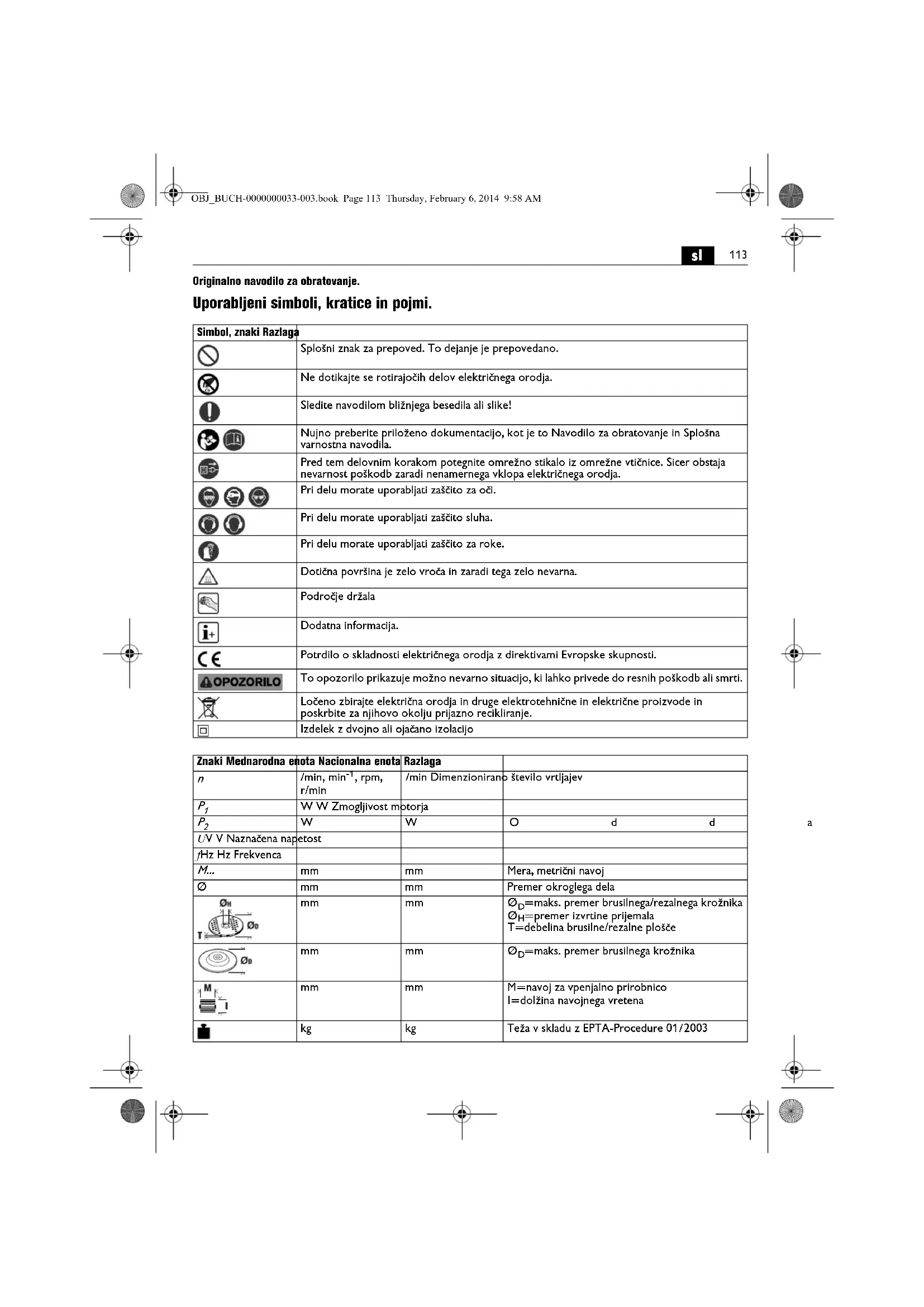 Originalno navodilo za obratovanje. Uporabljeni simboli, kratice in pojmi. Simbol, znaki Razlaga Splošni znak za prepoved. To dejanje je prepovedano. Ne dotikajte se rotirajočih delov električnega orodja. Sledite navodilom bližnjega besedila ali slike! Nujno preberite priloženo dokumentacijo, kot je to Navodilo za obratovanje in Splošna varnostna navodila. Pred tem delovnim korakom potegnite omrežno stikalo iz omrežne vtičnice. Sicer obstaja nevarnost poškodb zaradi nenamernega vklopa električnega orodja. Pri delu morate uporabljati zaščito za oči. Pri delu morate uporabljati zaščito sluha. Pri delu morate uporabljati zaščito za roke. Dotična površina je zelo vroča in zaradi tega zelo nevarna. Področje držala Dodatna informacija. Potrdilo o skladnosti električnega orodja z direktivami Evropske skupnosti. To opozorilo prikazuje možno nevarno situacijo, ki lahko privede do resnih poškodb ali smrti. Ločeno zbirajte električna orodja in druge elektrotehnične in električne proizvode in poskrbite za njihovo okolju prijazno recikliranje. Izdelek z dvojno ali ojačano izolacijo Znaki Mednarodna enota Nacionalna enota Razlaga