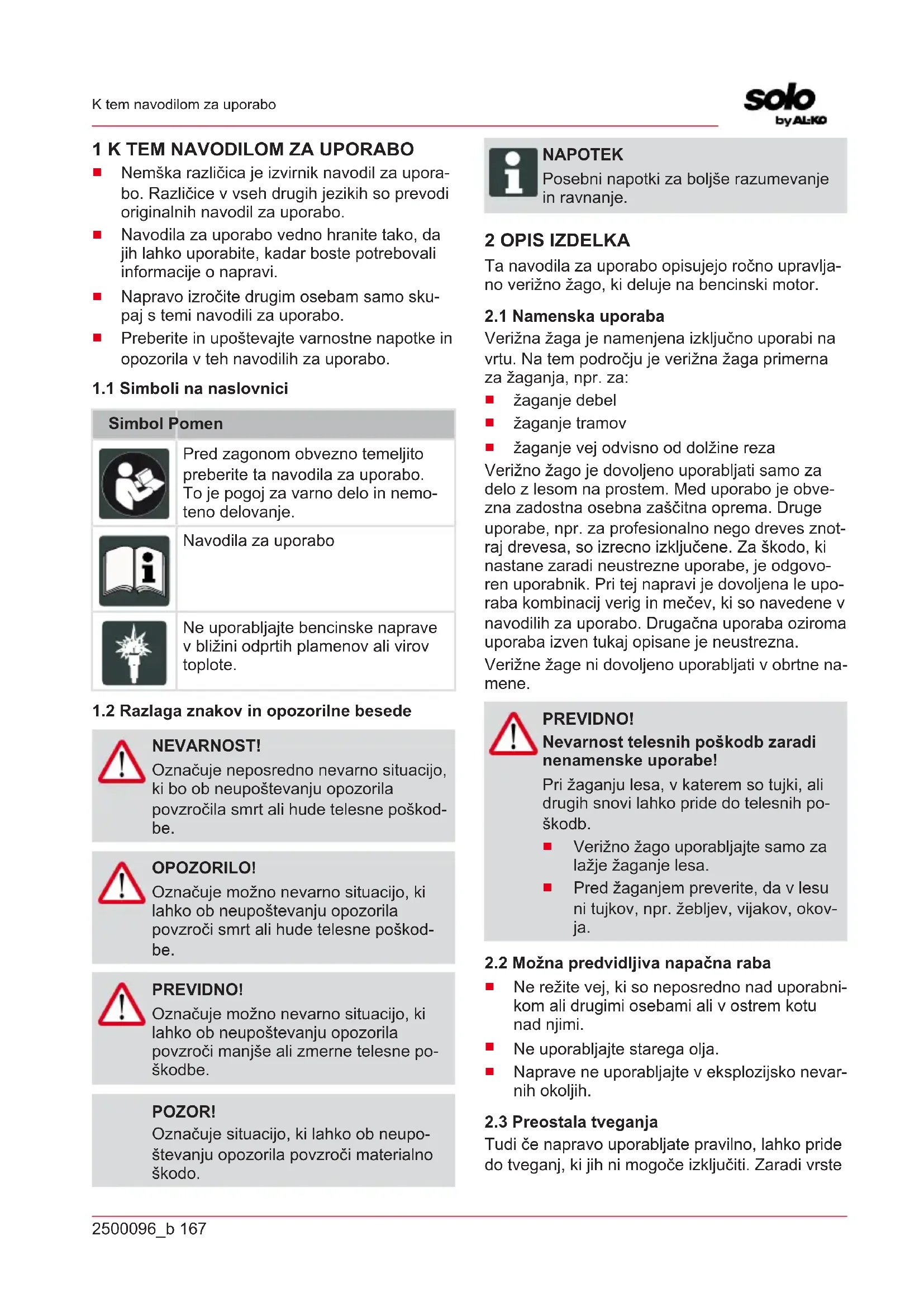 NEVARNOST! Označuje neposredno nevarno situacijo, ki bo ob neupoštevanju opozorila povzročila smrt ali hude telesne poškod- be. OPOZORILO! Označuje možno nevarno situacijo, ki lahko ob neupoštevanju opozorila povzroči smrt ali hude telesne poškod- be. PREVIDNO! Označuje možno nevarno situacijo, ki lahko ob neupoštevanju opozorila povzroči manjše ali zmerne telesne po- škodbe. POZOR! Označuje situacijo, ki lahko ob neupo- števanju opozorila povzroči materialno škodo. NAPOTEK Posebni napotki za boljše razumevanje in ravnanje. 2 OPIS IZDELKA Ta navodila za uporabo opisujejo ročno upravlja- no verižno žago, ki deluje na bencinski motor.