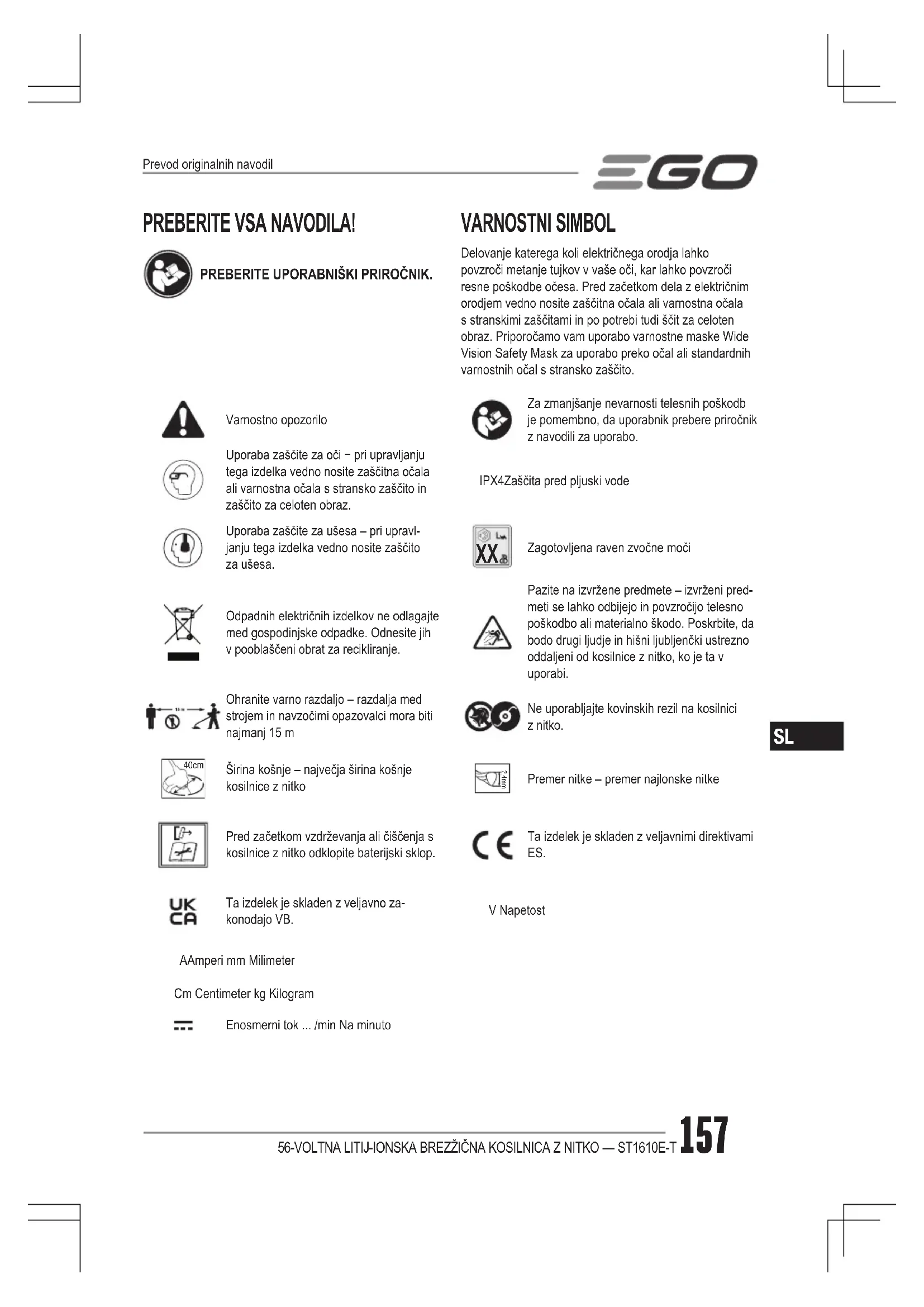 Zagotovljena raven zvočne močiOdpadnih električnih izdelkov ne odlagajte med gospodinjske odpadke. Odnesite jih v pooblaščeni obrat za recikliranje.Pazite na izvržene predmete – izvrženi pred-meti se lahko odbijejo in povzročijo telesno poškodbo ali materialno škodo. Poskrbite, da bodo drugi ljudje in hišni ljubljenčki ustrezno oddaljeni od kosilnice z nitko, ko je ta v uporabi.Ohranite varno razdaljo – razdalja med strojem in navzočimi opazovalci mora biti najmanj 15 mNe uporabljajte kovinskih rezil na kosilnici z nitko. 40cm Širina košnje – največja širina košnje kosilnice z nitko 2.4mmPremer nitke – premer najlonske nitkePred začetkom vzdrževanja ali čiščenja s kosilnice z nitko odklopite baterijski sklop. Ta izdelek je skladen z veljavnimi direktivami ES. Ta izdelek je skladen z veljavno za-konodajo VB.V NapetostA Amperi mm MilimeterCm Centimeter kg KilogramEnosmerni tok ... /min Na minutoPrevod originalnih navodil56-VOLTNA LITIJ-IONSKA BREZŽIČNA KOSILNICA Z NITKO — ST1610E-T158