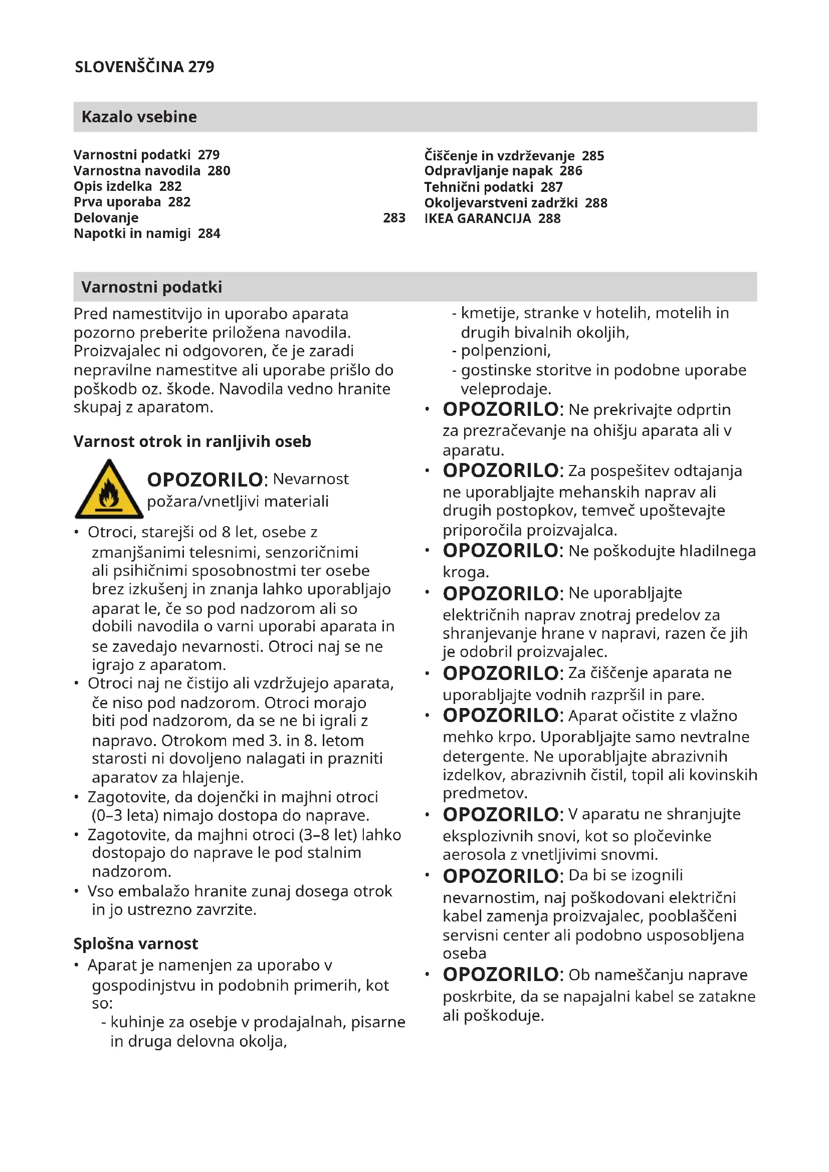 - Stroška za izvedbo prve namestitve aparata podjetja IKEA. Kakorkoli, če pod pogoji garancije aparat popravi serviser, ki ga napoti IKEA, ali pooblaščen servisni partner, potem bo popravljen aparat, če je to potrebno, tudi on ponovno namestil. Ta omejitev ne velja za delo brez napak, ki ga izvede usposobljen strokovnjak z uporabo naših originalnih delov, da bi prilagodil aparat specikacijam za tehnično varnost v drugi državi EU. Veljava državne zakonodaje Garancija IKEA zagotavlja posebne pravice, ki pokrivajo ali presegajo vse lokalne pravne zahteve. Vendar pa ti pogoji v nobenem smislu ne omejujejo potrošnikovih pravic, opisanih v lokalni zakonodaji. Območje veljavnosti Za aparata, kupljene v eni izmed držav EU in prepeljane v drugo državo EU, bodo storitve zagotovljene v okviru garancijskih pogojev, značilnih za novo državo. Dolžnost zagotoviti storitve v okviru garancije obstaja le, če aparat ustreza in je nameščena v skladu z/s: - Tehničnimi specikacijami držav, v kateri je vložen garancijski zahtevek; - Navodili za sestavljanje in varnostnimi navodili priročnika za uporabo. Namenske POPRODAJNE STORITVE za aparate IKEA Na službo za poprodajne storitve IKEA se obrnite: