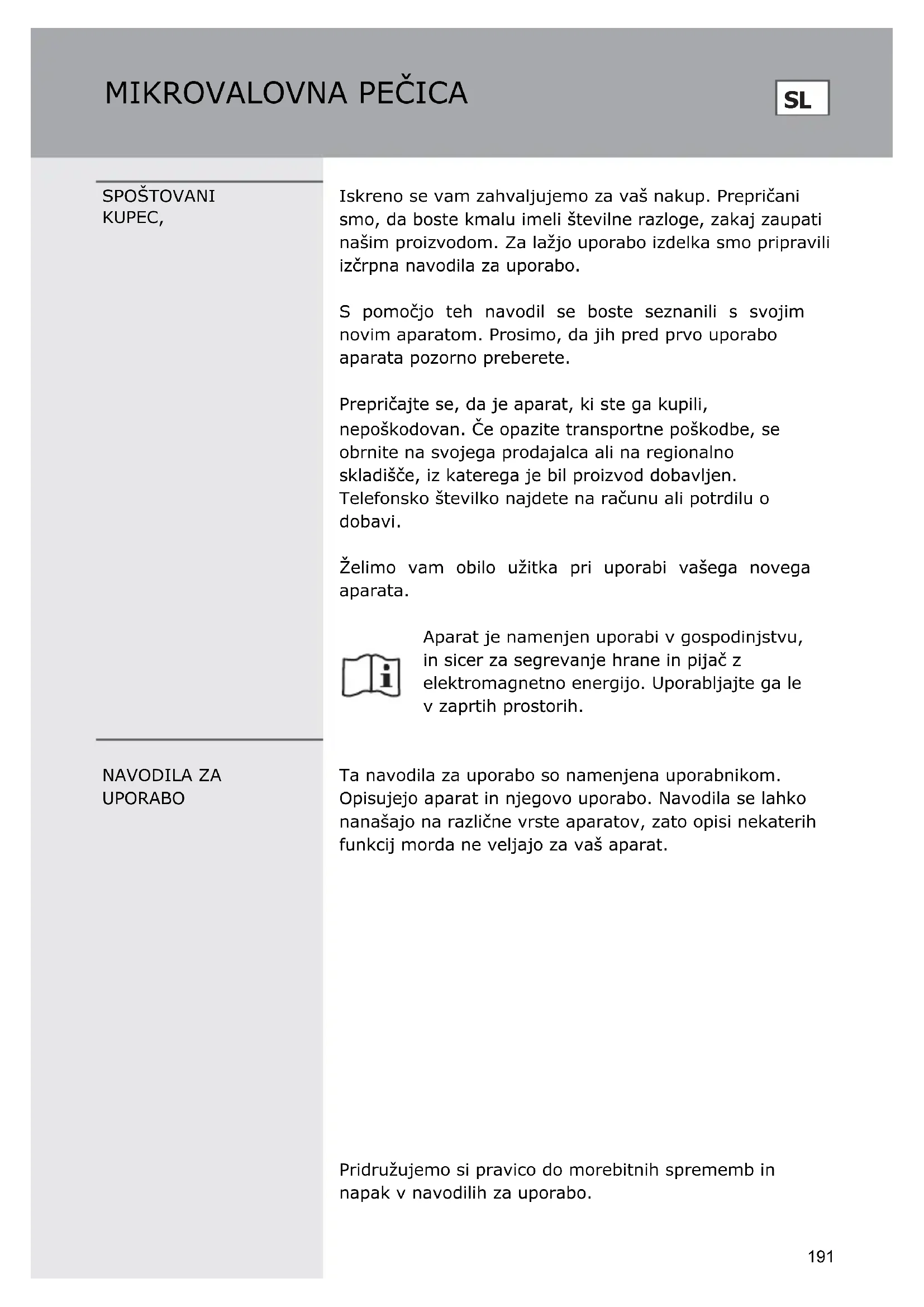 preverite, ali so vrata ustrezno zaprta in so varovala vključena. V nasprotnem primeru namreč ne bo mikrovalovne energije v pečici. Če noben od navedenih ukrepov ne odpravi motnje oz. napake, se obrnite na najbližjega pooblaščenega serviserja. Aparat je namenjen uporabi v gospodinjstvu, in sicer za segrevanje hrane in pijač z elektromagnetno energijo. Uporabljajte ga le v zaprtih prostorih.
