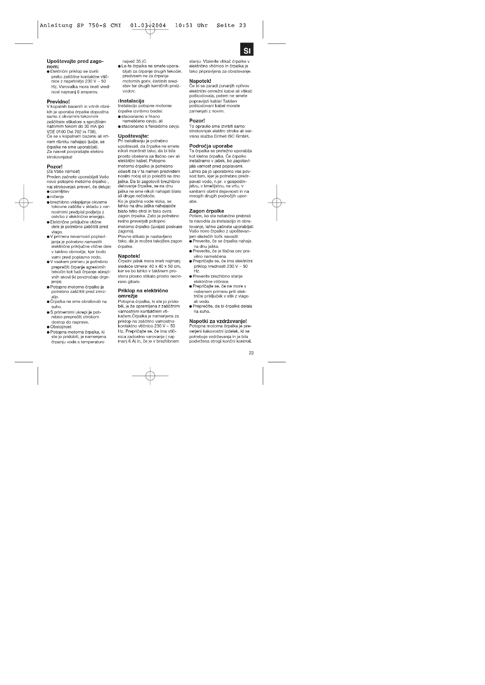 Instalacija Instalacijo potopne motorne črpalke izvršimo bodisi: stacionarno s fiksno nameščeno cevjo, ali stacionarno s fleksibilno cevjo. Upoštevajte: Pri instaliranju je potrebno upoštevati, da črpalke ne smete nikoli montirati tako, da bi bila prosto obešena za tlačno cev ali električni kabel. Potopno motorno črpalko je potrebno obesiti za v ta namen predvideni nosilni ročaj ali jo položiti na dno jaška. Da bi zagotovili brezhibno delovanje črpalke, se na dnu jaška ne sme nikoli nahajati blato ali druge nečistoče. Ko je gladina vode nizka, se lahko na dnu jaška nahajajoče blato hitro strdi in tako ovira zagon črpalke. Zato je potrebno redno preverjati potopno motorno črpalko (izvajati poskuse zagona). Plovno stikalo je nastavljeno tako, da je možen takojšen zagon črpalke. Napotek! Črpalni jašek mora imeti najmanj sledeče izmere: 40 x 40 x 50 cm, ker se bo lahko v takšnem pro- storu plovno stikalo prosto neovi- rano gibalo. Priklop na električno omrežje Potopna črpalka, ki ste jo prido- bili, je že opremljena z zaščitnim varnostnim kontaktnim vti- kačem.Črpalka je namenjena za priklop na zaščitno varnostno kontaktno vtičnico 230 V ~ 50 Hz. Prepričajte se, če ima vtič- nica zadostno varovanje ( naj- manj 6 A) in, če je v brezhibnem stanju. Vtaknite vtikač črpalke v električno vtičnico in črpalka je tako pripravljena za obratovanje. Napotek! Če bi se zaradi zunanjih vplivov električni omrežni kabel ali vtikač poškodovala, potem ne smete popravljati kabla! Takšen poškodovani kabel morate zamenjati z novim. Pozor! To opravilo sme izvršiti samo strokovnjak elektro stroke ali ser- visna služba Einhell ISC GmbH. Področja uporabe Ta črpalka se pretežno uporablja kot kletna črpalka. Če črpalko instaliramo v jašek, bo zagotavl- jala varnost pred poplavami. Lahko pa jo uporabimo vse pov- sod tam, kjer je potrebno prečr- pavati vodo, n.pr. v gospodin- jstvu, v kmetijstvu, na vrtu, v sanitarni obrtni dejavnosti in na mnogih drugih področjih upor- abe. Zagon črpalke Potem, ko ste natančno prebrali ta navodila za instalacijo in obra- tovanje, lahko začnete uporabljati Vašo novo črpalko z upoštevan- jem sledečih točk navodil: Preverite, če se črpalka nahaja na dnu jaška. Preverite, če je tlačna cev pra- vilno nameščena. Prepričajte se, če ima električni priklop vrednosti 230 V ~ 50 Hz. Preverite brezhibno stanje električne vtičnice. Prepričajte se, če ne more v nobenem primeru priti elek- trični priključek v stik z vlago ali vodo. Preprečite, da bi črpalka delala na suho. Napotki za vzdrževanje! Potopna motorna črpalka je pre- verjeni kakovostni izdelek, ki ne potrebuje vzdrževanja in je bila podvržena strogi končni kontroli. Anleitung SP 750-S CMI 01.03.2004 10:51 Uhr Seite 2324