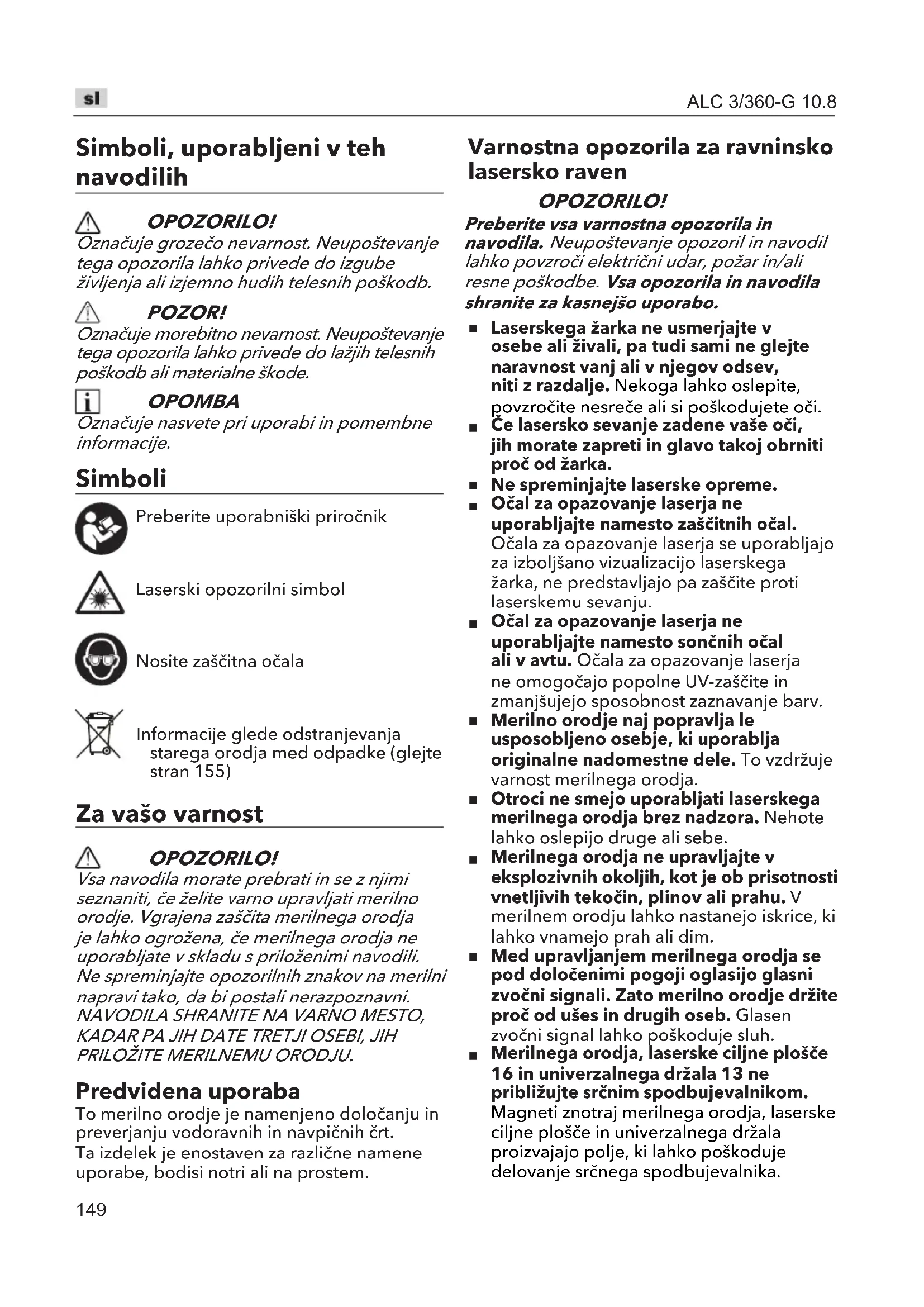 Merilnega orodja, laserske ciljne plošče 16 in univerzalnega držala 13 ne približujte srčnim spodbujevalnikom. Magneti znotraj merilnega orodja, laserske ciljne plošče in univerzalnega držala proizvajajo polje, ki lahko poškoduje delovanje srčnega spodbujevalnika.150 ALC 3/360-G 10.8