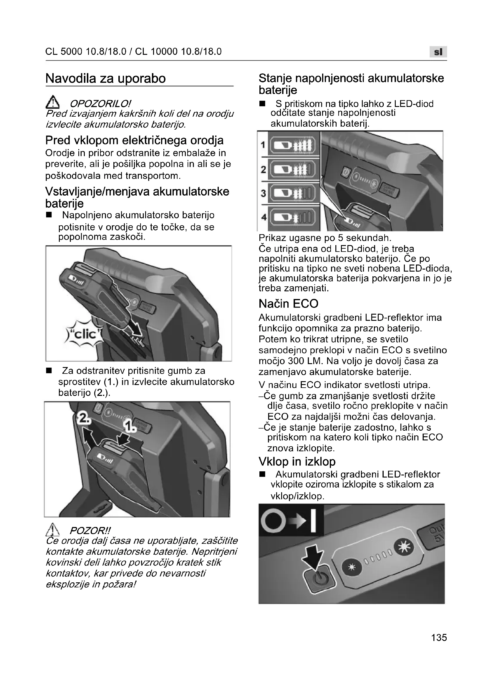 Navodila za uporabo OPOZORILO! Pred izvajanjem kakršnih koli del na orodju izvlecite akumulatorsko baterijo. Pred vklopom električnega orodja Orodje in pribor odstranite iz embalaže in preverite, ali je pošiljka popolna in ali se je poškodovala med transportom. Vstavljanje/menjava akumulatorske baterije Napolnjeno akumulatorsko baterijo potisnite v orodje do te točke, da se popolnoma zaskoči. Za odstranitev pritisnite gumb za sprostitev (1.) in izvlecite akumulatorsko baterijo (2.). POZOR!! Če orodja dalj časa ne uporabljate, zaščitite kontakte akumulatorske baterije. Nepritrjeni kovinski deli lahko povzročijo kratek stik kontaktov, kar privede do nevarnosti eksplozije in požara! Stanje napolnjenosti akumulatorske baterije S pritiskom na tipko lahko z LED-diod odčitate stanje napolnjenosti akumulatorskih baterij. Prikaz ugasne po 5 sekundah. Če utripa ena od LED-diod, je treba napolniti akumulatorsko baterijo. Če po pritisku na tipko ne sveti nobena LED-dioda, je akumulatorska baterija pokvarjena in jo je treba zamenjati. Način ECO Akumulatorski gradbeni LED-reflektor ima funkcijo opomnika za prazno baterijo. Potem ko trikrat utripne, se svetilo samodejno preklopi v način ECO s svetilno močjo 300 LM. Na voljo je dovolj časa za zamenjavo akumulatorske baterije. V načinu ECO indikator svetlosti utripa. – Če gumb za zmanjšanje svetlosti držite dlje časa, svetilo ročno preklopite v način ECO za najdaljši možni čas delovanja. – Če je stanje baterije zadostno, lahko s pritiskom na katero koli tipko način ECO znova izklopite. Vklop in izklop Akumulatorski gradbeni LED-reflektor vklopite oziroma izklopite s stikalom za vklop/izklop.CL 5000 10.8/18.0 / CL 10000 10.8/18.0