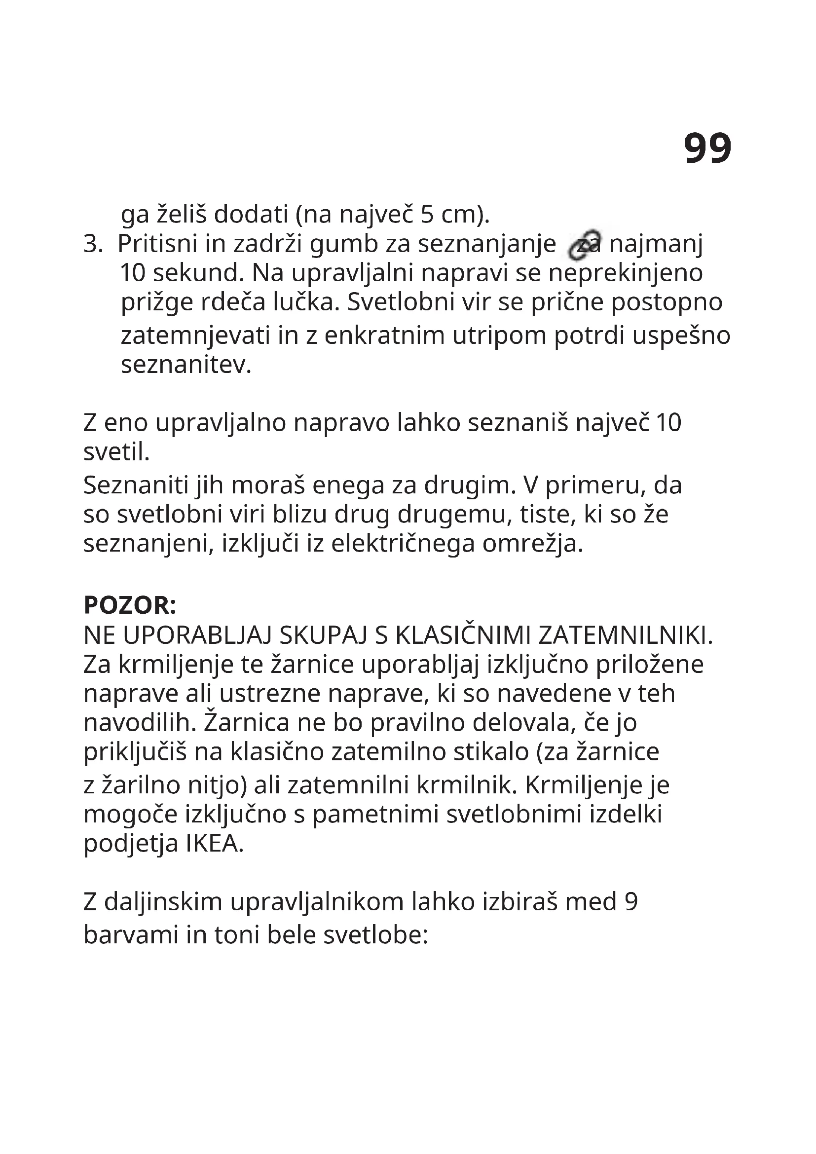 10 sekund. Na upravljalni napravi se neprekinjeno prižge rdeča lučka. Svetlobni vir se prične postopno zatemnjevati in z enkratnim utripom potrdi uspešno seznanitev. Z eno upravljalno napravo lahko seznaniš največ 10 svetil. Seznaniti jih moraš enega za drugim. V primeru, da so svetlobni viri blizu drug drugemu, tiste, ki so že seznanjeni, izključi iz električnega omrežja. POZOR: NE UPORABLJAJ SKUPAJ S KLASIČNIMI ZATEMNILNIKI. Za krmiljenje te žarnice uporabljaj izključno priložene naprave ali ustrezne naprave, ki so navedene v teh navodilih. Žarnica ne bo pravilno delovala, če jo priključiš na klasično zatemilno stikalo (za žarnice z žarilno nitjo) ali zatemnilni krmilnik. Krmiljenje je mogoče izključno s pametnimi svetlobnimi izdelki podjetja IKEA. Z daljinskim upravljalnikom lahko izbiraš med 9 barvami in toni bele svetlobe:100 Beli toni hladno bela – 4000 Kelvinov toplo bela – 2700 Kelvinov toplo sijoča – 2200 Kelvinov svetloba sveče – 1780 Kelvinov Barve jantarjeva, temno breskova, temno rožnata, svetlo vijolična, svetlo modra Ob hkratni uporabi aplikacije in prehoda, lahko izbiraš med 20 barvami in toni bele svetlobe: Beli toni hladno nebo – 6000 Kelvinov hladna dnevna svetloba – 5000 Kelvinov hladno bela – 4000 Kelvinov sončni vzhod – 3000 Kelvin toplo bela – 2700 Kelvinov toplo sijoča – 2200 Kelvinov svetloba sveče – 1780 Kelvinov Barve jantarjeva, breskova, temno breskova, temno rdeča, rožnata, svetlo rožnata, temno rožnata, svetlo vijolična, temno vijolična, modra, svetlo modra, limetina, rumena101 PONASTAVITEV NAPRAVE Glavno stikalo pritisni 6-krat. TEHNIČNIPODATKI Delovna frekvenca: 2405-2480 Mhz Izhodnamoč:10 dBm Proizvajalec: IKEA of Sweden AB Naslov:Box702,SE-34381Älmhult,ŠVEDSKA Znak s prečrtanim izvlečnim zabojnikom pomeni, da izdelek ne spada med običajne gospodinjske odpadke. Izdelek je treba zavreči oziroma reciklirati v skladu z lokalnimi okoljevarstvenimi predpisi. Z ločevanjem odpadkov se zmanjša količina odpadkov v sežigalnicah in na smetiščih in s tem morebiten negativen vpliv na človekovo zdravje in okolje. Dodatne informacije so na voljo v najbližji trgovini IKEA.102 Türkçe KONTROLCİHAZINAAMPULEKLEYİN: Ampulü kullanmadan önce, onu bir kontrol cihazı ile eşleştirmeniz gerekir. Daha fazla ampul eklemek için aşağıdaki adımları tekrarlayınız: