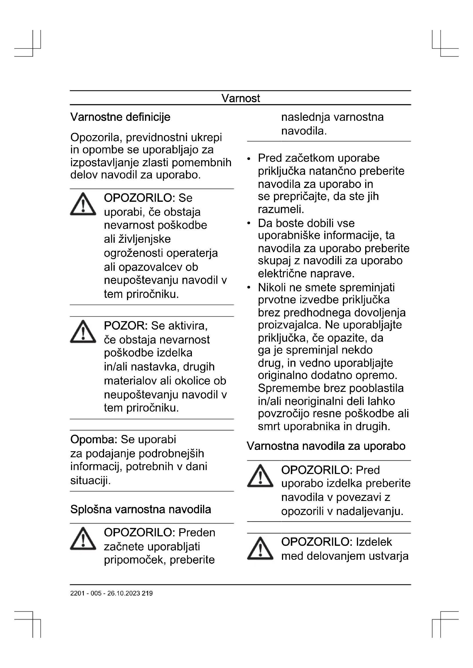 Tehnični podatki na strani 225 in na oznaki. (Sl. 11) Izdelek ne sme biti izpostavljen dežju. (Sl. 12) Pred vzdrževanjem odklopite baterijo. (Sl. 13) OPOZORILO – Pazite na leteče predmete. (Sl. 14) OPOZORILO – Pazite na osebe. Opomba: Ostali znaki in nalepke na priključku se nanašajo na specifične certifikacijske zahteve, ki veljajo na nekaterih tržiščih. 218 2201 - 005 - 26.10.2023Varnost Varnostne definicije Opozorila, previdnostni ukrepi in opombe se uporabljajo za izpostavljanje zlasti pomembnih delov navodil za uporabo. OPOZORILO: Se uporabi, če obstaja nevarnost poškodbe ali življenjske ogroženosti operaterja ali opazovalcev ob neupoštevanju navodil v tem priročniku. POZOR: Se aktivira, če obstaja nevarnost poškodbe izdelka in/ali nastavka, drugih materialov ali okolice ob neupoštevanju navodil v tem priročniku. Opomba: Se uporabi za podajanje podrobnejših informacij, potrebnih v dani situaciji. Splošna varnostna navodila OPOZORILO: Preden začnete uporabljati pripomoček, preberite naslednja varnostna navodila.