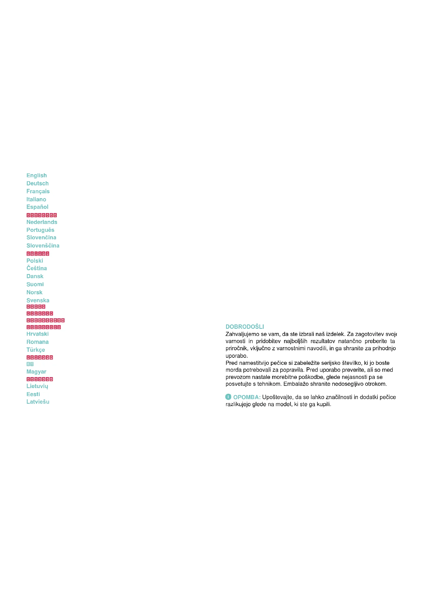 DOBRODOŠLI Zahvaljujemo se vam, da ste izbrali naš izdelek. Za zagotovitev svoje varnosti in pridobitev najboljših rezultatov natančno preberite ta priročnik, vključno z varnostnimi navodili, in ga shranite za prihodnjo uporabo. Pred namestitvijo pečice si zabeležite serijsko številko, ki jo boste morda potrebovali za popravila. Pred uporabo preverite, ali so med prevozom nastale morebitne poškodbe, glede nejasnosti pa se posvetujte s tehnikom. Embalažo shranite nedosegljivo otrokom. OPOMBA: Upoštevajte, da se lahko značilnosti in dodatki pečice razlikujejo glede na model, ki ste ga kupili.POVZETEK