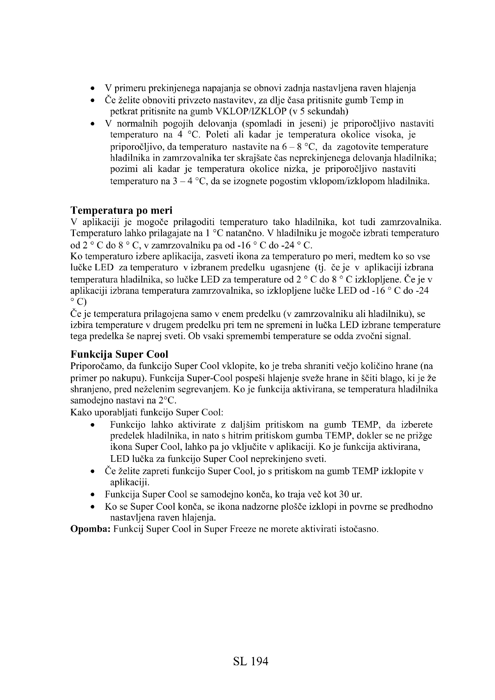 g.SL 194 V primeru prekinjenega napajanja se obnovi zadnja nastavljena raven hlajenja Če želite obnoviti privzeto nastavitev, za dlje časa pritisnite gumb Temp in petkrat pritisnite na gumb VKLOP/IZKLOP (v 5 sekundah) V normalnih pogojih delovanja (spomladi in jeseni) je priporočljivo nastaviti temperaturo na 4 °C. Poleti ali kadar je temperatura okolice visoka, je priporočljivo, da temperaturo nastavite na 6 – 8 °C, da zagotovite temperature hladilnika in zamrzovalnika ter skrajšate čas neprekinjenega delovanja hladilnika; pozimi ali kadar je temperatura okolice nizka, je priporočljivo nastaviti temperaturo na 3 – 4 °C, da se izognete pogostim vklopom/izklopom hladilnika. Temperatura po meri V aplikaciji je mogoče prilagoditi temperaturo tako hladilnika, kot tudi zamrzovalnika. Temperaturo lahko prilagajate na 1 °C natančno. V hladilniku je mogoče izbrati temperaturo od 2 ° C do 8 ° C, v zamrzovalniku pa od -16 ° C do -24 ° C. Ko temperaturo izbere aplikacija, zasveti ikona za temperaturo po meri, medtem ko so vse lučke LED za temperaturo v izbranem predelku ugasnjene (tj. če je v aplikaciji izbrana temperatura hladilnika, so lučke LED za temperature od 2 ° C do 8 ° C izklopljene. Če je v aplikaciji izbrana temperatura zamrzovalnika, so izklopljene lučke LED od -16 ° C do -24 ° C) Če je temperatura prilagojena samo v enem predelku (v zamrzovalniku ali hladilniku), se izbira temperature v drugem predelku pri tem ne spremeni in lučka LED izbrane temperature tega predelka še naprej sveti. Ob vsaki spremembi temperature se odda zvočni signal. Funkcija Super Cool Priporočamo, da funkcijo Super Cool vklopite, ko je treba shraniti večjo količino hrane (na primer po nakupu). Funkcija Super-Cool pospeši hlajenje sveže hrane in ščiti blago, ki je že shranjeno, pred neželenim segrevanjem. Ko je funkcija aktivirana, se temperatura hladilnika samodejno nastavi na 2°C. Kako uporabljati funkcijo Super Cool: Funkcijo lahko aktivirate z daljšim pritiskom na gumb TEMP, da izberete predelek hladilnika, in nato s hitrim pritiskom gumba TEMP, dokler se ne prižge ikona Super Cool, lahko pa jo vključite v aplikaciji. Ko je funkcija aktivirana, LED lučka za funkcijo Super Cool neprekinjeno sveti. Če želite zapreti funkcijo Super Cool, jo s pritiskom na gumb TEMP izklopite v aplikaciji. Funkcija Super Cool se samodejno konča, ko traja več kot 30 ur. Ko se Super Cool konča, se ikona nadzorne plošče izklopi in povrne se predhodno nastavljena raven hlajenja. Opomba: Funkcij Super Cool in Super Freeze ne morete aktivirati istočasno.SL 195 Funkcija Super Freeze Funkcija Super Freeze pospeši zamrzovanje svežih živil in ščiti blago, ki je že shranjeno pred neželenim segrevanjem. Če je treba zamrzniti večjo količino živil, priporočamo, da funkcijo Super Freeze pred uporabo nastavite na 24 ur. Ko je funkcija aktivirana, se temperatura hladilnika samodejno nastavi na -24 °C. Kako uporabljati funkcijo Super Freeze: Funkcijo lahko vključite z daljšim pritiskom na gumb TEMP, da izberete predelek zamrzovalnika, in nato s hitrim pritiskom gumba TEMP, dokler se ne prižge ikona Super Freeze, lahko pa jo vključite v aplikaciji. Ko je funkcija aktivirana, LED lučka za funkcijo Super Freeze neprekinjeno sveti. Če želite zapreti funkcijo Super Freeze, jo s pritiskom na gumb TEMP izklopite v aplikaciji. Funkcija Super Freeze se samodejno konča, ko traja več kot 50 ur. Ko se Super Freeze konča, se ikona nadzorne plošče izklopi in povrne se predhodno nastavljena raven zamrzovanja. Opomba: Funkcij Super Cool in Super Freeze ne morete aktivirati istočasno. Način ECO Način Eco lahko aktivirate, da optimizirate delovanje naprave, hkrati pa zagotovite najboljše shranjevanje živil. Način Eco samodejno nastavi na 5 °C v hladilniku in -18 °C v zamrzovalniku Kako uporabljati Eco: Funkcijo lahko na nadzorni plošči aktivirate s pritiskom na gumb “mode”, dokler ne zasveti ikona za način Eco (izbiro potrdi zvočni signal), ali pa funkcijo izberete v aplikaciji. Ko je funkcija aktivirana, ikona za način Eco neprekinjeno sveti. Če želite zapustiti funkcijo Eco, jo izključite v aplikaciji ali na nadzorni plošči izberite drugo funkcijo. Ko se način Eco konča, se ikona nadzorne plošče izklopi in povrnejo se predhodno nastavljene ravni hlajenja. Funkcija Holiday Funkcijo Holiday lahko uporabite za zmanjšanje porabe energije naprave, kadar je ne uporabljate redno. Ko se funkcija izključi, se LED lučke (tudi če so vrata odprta) in hladilnik izključijo, zamrzovalnik pa bo normalno deloval. Kako uporabljati funkcijo Holiday: Funkcijo lahko na nadzorni plošči aktivirate s pritiskom na gumb “mode”, dokler ne zasveti ikona za način Holiday (izbiro potrdi zvočni signal), ali pa funkcijo izberete v aplikaciji. Ko je funkcija aktivirana, ikona za način Holiday neprekinjeno sveti. Če želite zapustiti funkcijo Holiday, jo izključite v aplikaciji ali na nadzorni plošči izberite drugo funkcijo. Ko se način Holiday izključi, se ikona nadzorne plošče izklopi in povrnejo se predhodno nastavljene ravni hlajenja. Odmrzovanje Odmrzovanje predelkov hladilnika in zamrzovalnika se izvede samodejno: ročno upravljanje ni potrebno.SL 196 Napaka v komunikaciji Lučke [-16 °C; -18 °C; -20 °C; -22 °C; -24 °C] v zamrzovalniku se zaporedoma prižigajo, kar pomeni, da je prišlo do napake v komunikaciji med glavno nadzorno ploščo in zaslonom. Za pomoč pri reševanju težave se obrnite na tehnično pomoč Ventilator Lučke [-16 °C; -20 °C; -22 °C; -24 °C] v zamrzovalniku hkrati utripajo, kar pomeni, da ventilator ne deluje pravilno- Za pomoč pri reševanju težave se obrnite na tehnično pomoč HCS Ko je dosežena določena raven vlage, se filtrirna vlakna HCS odprejo, kar povzroči zmanjšanje vlage in se nato ponovno zaprejo. Predstavitveni način Če želite pri zaklenjenem zaslonu vstopiti v predstavitveni način, dolgo pritiskajte gumb SE