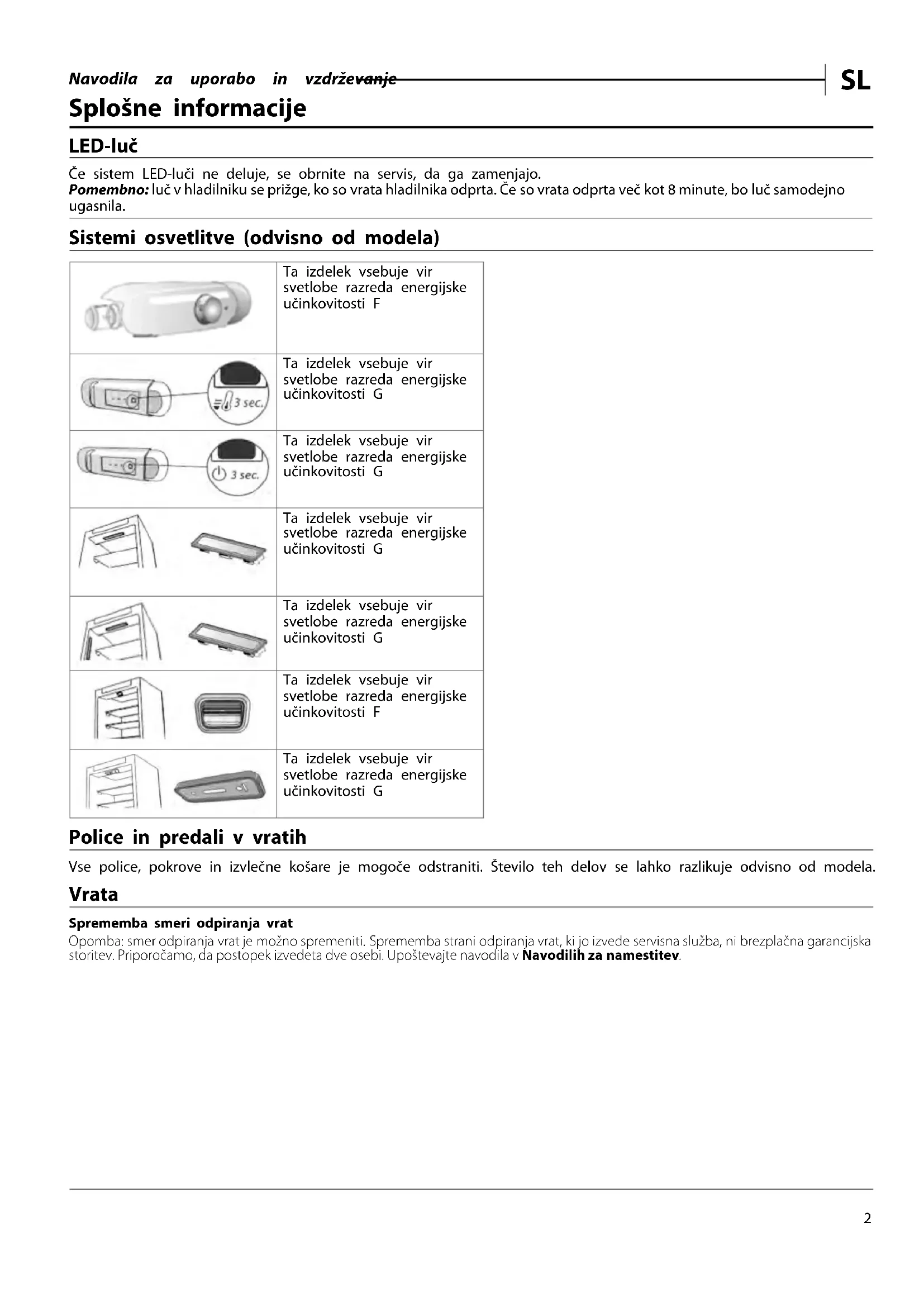Splošne informacije LED-luč Če sistem LED-luči ne deluje, se obrnite na servis, da ga zamenjajo. Pomembno: luč v hladilniku se prižge, ko so vrata hladilnika odprta. Če so vrata odprta več kot 8 minute, bo luč samodejno ugasnila. Sistemi osvetlitve (odvisno od modela) Ta izdelek vsebuje vir svetlobe razreda energijske učinkovitosti F Ta izdelek vsebuje vir svetlobe razreda energijske učinkovitosti G Ta izdelek vsebuje vir svetlobe razreda energijske učinkovitosti G Ta izdelek vsebuje vir svetlobe razreda energijske učinkovitosti G Ta izdelek vsebuje vir svetlobe razreda energijske učinkovitosti G Ta izdelek vsebuje vir svetlobe razreda energijske učinkovitosti F Ta izdelek vsebuje vir svetlobe razreda energijske učinkovitosti G Police in predali v vratih Vse police, pokrove in izvlečne košare je mogoče odstraniti. Število teh delov se lahko razlikuje odvisno od modela. Vrata Sprememba smeri odpiranja vrat Opomba: smer odpiranja vrat je možno spremeniti. Sprememba strani odpiranja vrat, ki jo izvede servisna služba, ni brezplačna garancijska storitev. Priporočamo, da postopek izvedeta dve osebi. Upoštevajte navodila v Navodilih za namestitev.Navodila za uporabo in vzdrževanje