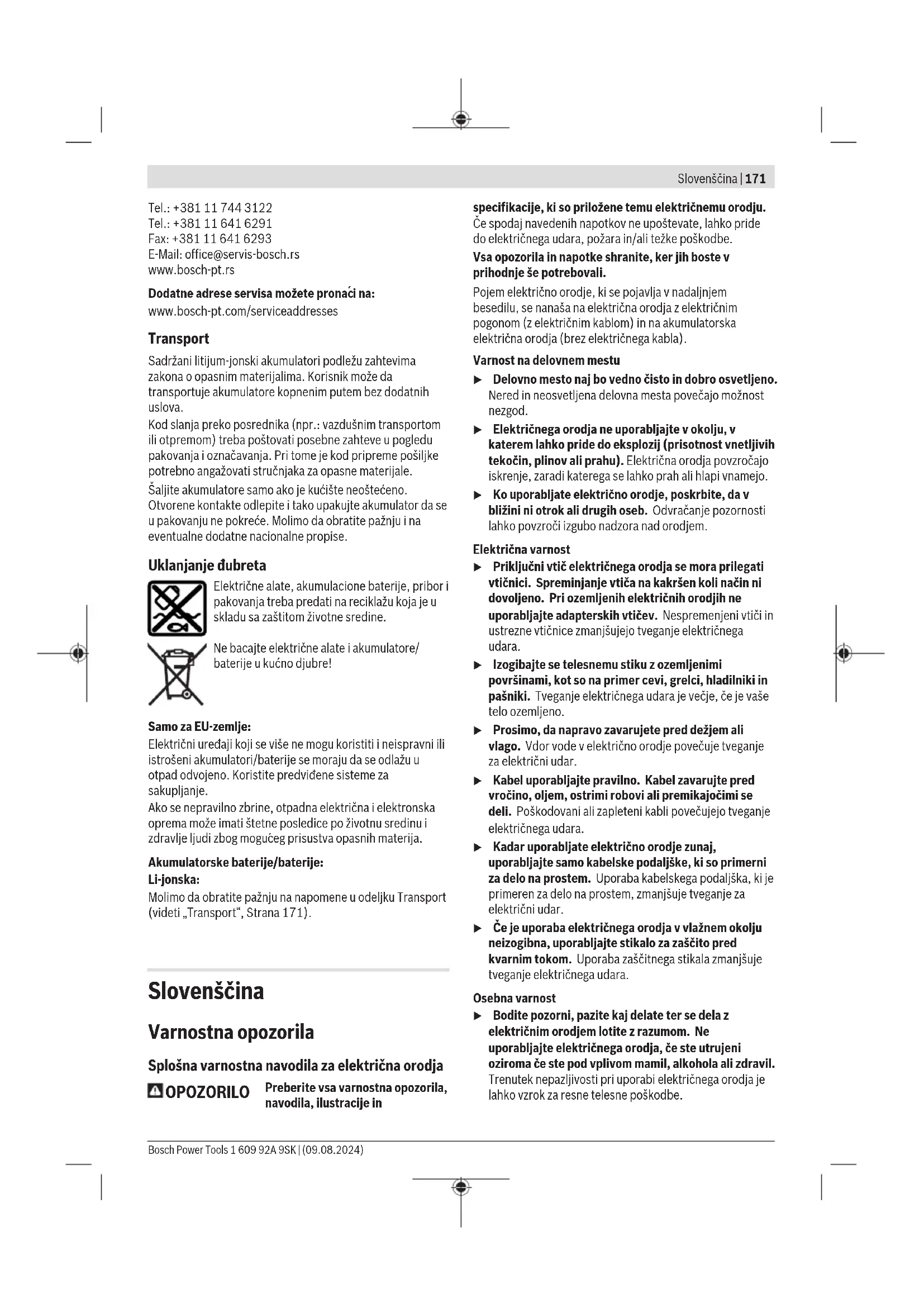 i na: www.bosch-pt.com/serviceaddresses Transport Sadržani litijum-jonski akumulatori podležu zahtevima zakona o opasnim materijalima. Korisnik može da transportuje akumulatore kopnenim putem bez dodatnih uslova. Kod slanja preko posrednika (npr.: vazdušnim transportom ili otpremom) treba poštovati posebne zahteve u pogledu pakovanja i označavanja. Pri tome je kod pripreme pošiljke potrebno angažovati stručnjaka za opasne materijale. Šaljite akumulatore samo ako je kućište neoštećeno. Otvorene kontakte odlepite i tako upakujte akumulator da se u pakovanju ne pokreće. Molimo da obratite pažnju i na eventualne dodatne nacionalne propise. Uklanjanje đubreta Električne alate, akumulacione baterije, pribor i pakovanja treba predati na reciklažu koja je u skladu sa zaštitom životne sredine. Ne bacajte električne alate i akumulatore/ baterije u kućno djubre! Samo za EU‑zemlje: Električni uređaji koji se više ne mogu koristiti i neispravni ili istrošeni akumulatori/baterije se moraju da se odlažu u otpad odvojeno. Koristite predviđene sisteme za sakupljanje. Ako se nepravilno zbrine, otpadna električna i elektronska oprema može imati štetne posledice po životnu sredinu i zdravlje ljudi zbog moguceg prisustva opasnih materija. Akumulatorske baterije/baterije: Li-jonska: Molimo da obratite pažnju na napomene u odeljku Transport (videti „Transport“, Strana171). Slovenščina Varnostna opozorila Splošna varnostna navodila za električna orodja OPOZORILO Preberite vsa varnostna opozorila, navodila, ilustracije in specifikacije, ki so priložene temu električnemu orodju. Če spodaj navedenih napotkov ne upoštevate, lahko pride do električnega udara, požara in/ali težke poškodbe. Vsa opozorila in napotke shranite, ker jih boste v prihodnje še potrebovali. Pojem električno orodje, ki se pojavlja v nadaljnjem besedilu, se nanaša na električna orodja z električnim pogonom (z električnim kablom) in na akumulatorska električna orodja (brez električnega kabla). Varnost na delovnem mestu u Delovno mesto naj bo vedno čisto in dobro osvetljeno. Nered in neosvetljena delovna mesta povečajo možnost nezgod. u Električnega orodja ne uporabljajte v okolju, v katerem lahko pride do eksplozij (prisotnost vnetljivih tekočin, plinov ali prahu). Električna orodja povzročajo iskrenje, zaradi katerega se lahko prah ali hlapi vnamejo. u Ko uporabljate električno orodje, poskrbite, da v bližini ni otrok ali drugih oseb. Odvračanje pozornosti lahko povzroči izgubo nadzora nad orodjem. Električna varnost u Priključni vtič električnega orodja se mora prilegati vtičnici. Spreminjanje vtiča na kakršen koli način ni dovoljeno. Pri ozemljenih električnih orodjih ne uporabljajte adapterskih vtičev. Nespremenjeni vtiči in ustrezne vtičnice zmanjšujejo tveganje električnega udara. u Izogibajte se telesnemu stiku z ozemljenimi površinami, kot so na primer cevi, grelci, hladilniki in pašniki. Tveganje električnega udara je večje, če je vaše telo ozemljeno. u Prosimo, da napravo zavarujete pred dežjem ali vlago. Vdor vode v električno orodje povečuje tveganje za električni udar. u Kabel uporabljajte pravilno. Kabel zavarujte pred vročino, oljem, ostrimi robovi ali premikajočimi se deli. Poškodovani ali zapleteni kabli povečujejo tveganje električnega udara. u Kadar uporabljate električno orodje zunaj, uporabljajte samo kabelske podaljške, ki so primerni za delo na prostem. Uporaba kabelskega podaljška, ki je primeren za delo na prostem, zmanjšuje tveganje za električni udar. u Če je uporaba električnega orodja v vlažnem okolju neizogibna, uporabljajte stikalo za zaščito pred kvarnim tokom. Uporaba zaščitnega stikala zmanjšuje tveganje električnega udara. Osebna varnost u Bodite pozorni, pazite kaj delate ter se dela z električnim orodjem lotite z razumom. Ne uporabljajte električnega orodja, če ste utrujeni oziroma če ste pod vplivom mamil, alkohola ali zdravil. Trenutek nepazljivosti pri uporabi električnega orodja je lahko vzrok za resne telesne poškodbe. Bosch Power Tools 1 609 92A 9SK | (09.08.2024)172 | Slovenščina u Uporabljajte osebno zaščitno opremo. Vedno uporabljajte zaščito za oči. Z uporabo zaščitne opreme, kot so protiprašna maska, varnostni čevlji, ki ne drsijo, čelada ali zaščita za sluh, v ustreznih okoliščinah zmanjšate nevarnost poškodb. u Preprečite nenameren vklop orodja. Pred priključitvijo električnega orodja na električno omrežje in/ali na akumulatorsko baterijo in pred dviganjem ali nošenjem se prepričajte, da je električno orodje izklopljeno. Če električno orodje nosite in imate pri tem prst na stikalu ali pa orodje napajate, ko je stikalo v položaju za vklop, lahko pride do nesreče. u Odstranite vse ključe in izvijače za prilagajanje orodja, preden orodje vključite. Ključ ali izvijač, ki ga ne odstranite z vrtečega se dela električnega orodja, lahko povzroči telesne poškodbe. u Ne precenjujte svojih sposobnosti. Ves čas trdno stojite in vzdržujte ravnovesje. To omogoča boljši nadzor nad električnim orodjem v nepričakovanih situacijah. u Bodite primerno oblečeni. Ne nosite ohlapnih oblačil ali nakita. Las in oblačil ne približujte premikajočim se delom. Ohlapna oblačila, nakit ali dolgi lasje se lahko ujamejo v premikajoče se dele. u Če imate na voljo naprave za priklop sesalnika za prah ali zbiralnih posod, se prepričajte, da so te ustrezno priključene. Uporaba sistema za zbiranje prahu lahko zmanjša nevarnosti, povezane s prahom. u Naj seznanjenost z orodjem, ki jo pridobite s pogosto uporabo, ne bo razlog za to, da postanete lahkomiselni in ignorirate varnostna načela. V delčku sekunde lahko nepozorno dejanje pripelje do hude poškodbe. Uporaba in vzdrževanje električnega orodja u Električnega orodja ne preobremenjujte. Za delo uporabite ustrezno električno orodje. Pravo električno orodje bo delo opravilo bolje in varneje, in sicer s h