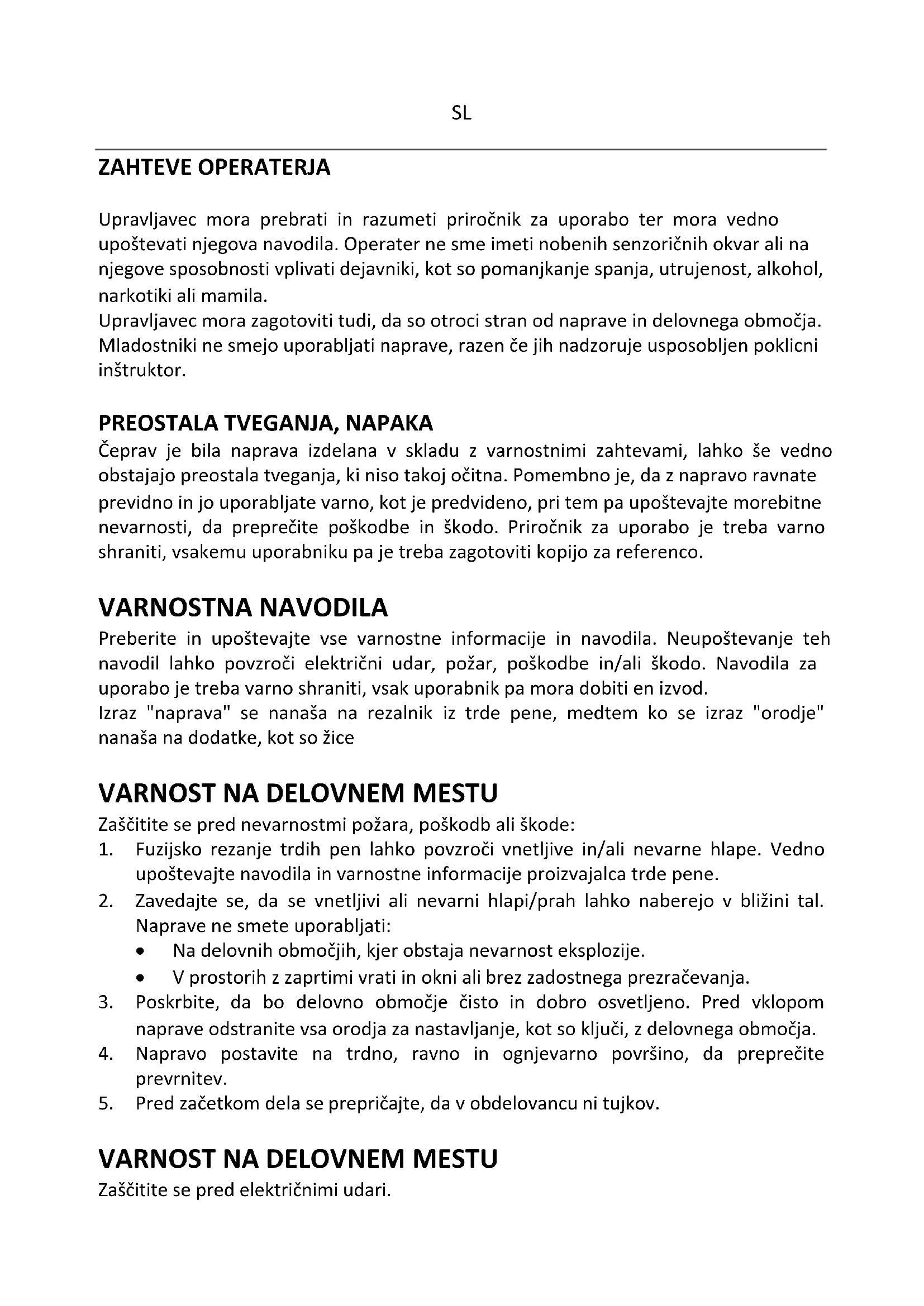 POZOR! Kljub varni zasnovi naprave in njenim zaščitnim funkcijam ter kljub uporabi dodatnih elementov, ki ščitijo operaterja, pri uporabi naprave še vedno obstaja majhna nevarnost nesreče ali poškodbe. Bodite pozorni in pri uporabi naprave uporabljajte zdrav razum.SL