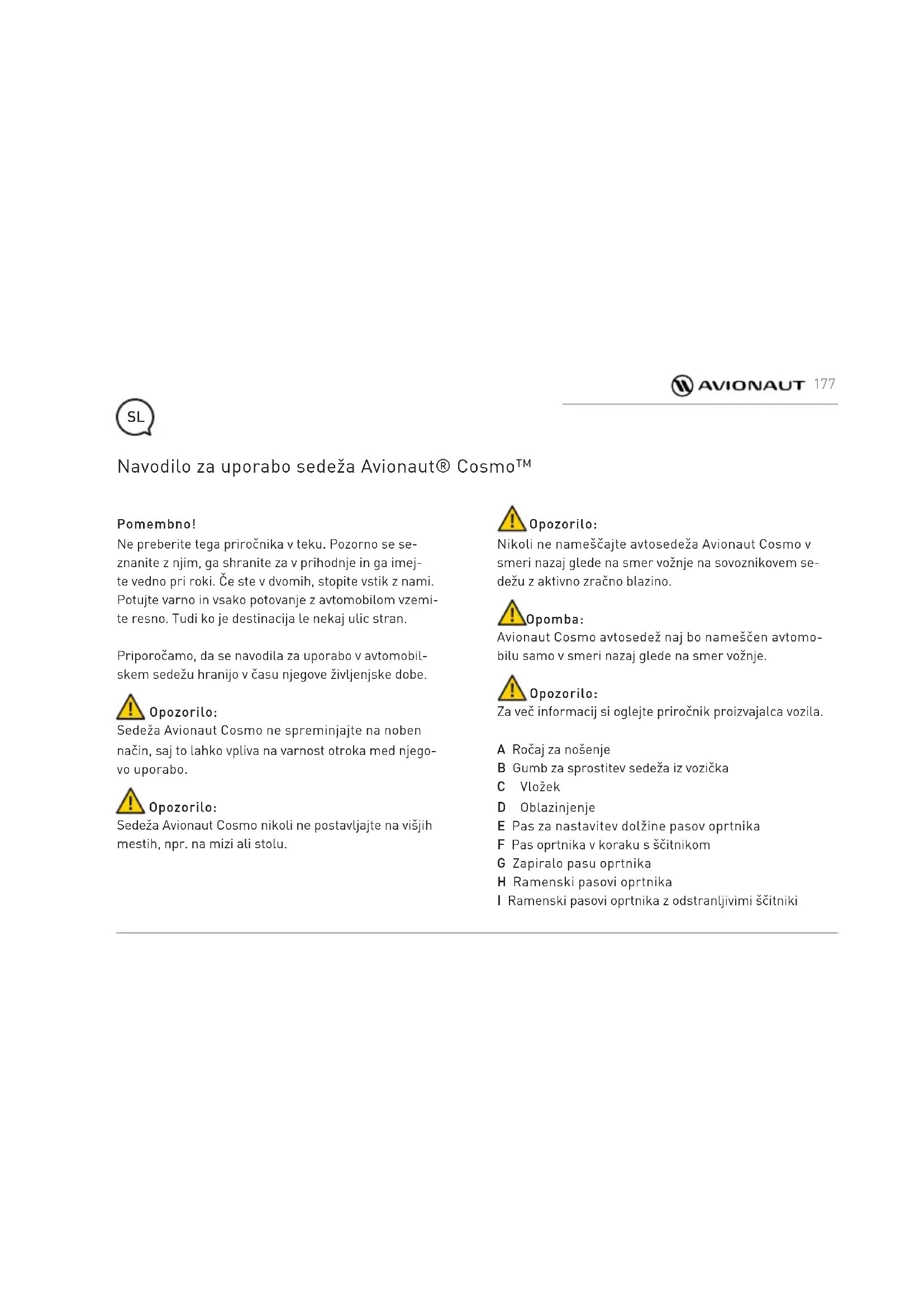 - Tato záruka bola pripravená firmou Ł.KARWALA zaregistrovanou v Poľsku. Adresa firmy je: Szarlejka, ul. Lukaszewicza 172 42-130 Wreczyca Wielka, Polska (1) Zakúpené výrobky sodstránenými alebo zmenenými etiketami alebo identifikačnými číslami sú považované za neautorizované. V súvislosti s tým, že autenticita takých výrobkov sa nedá určiť, záruka sa na nich nevzťahuje. 176Pomembno! Ne preberite tega priročnika v teku. Pozorno se se- znanite z njim, ga shranite za v prihodnje in ga imej- te vedno pri roki. Če ste v dvomih, stopite vstik z nami. Potujte varno in vsako potovanje z avtomobilom vzemi- te resno. Tudi ko je destinacija le nekaj ulic stran. Priporočamo, da se navodila za uporabo v avtomobil- skem sedežu hranijo v času njegove življenjske dobe. Opozorilo: Sedeža Avionaut Cosmo ne spreminjajte na noben način, saj to lahko vpliva na varnost otroka med njego- vo uporabo. Opozorilo: Sedeža Avionaut Cosmo nikoli ne postavljajte na višjih mestih, npr. na mizi ali stolu. Navodilo za uporabo sedeža Avionaut® Cosmo™ Opozorilo: Nikoli ne nameščajte avtosedeža Avionaut Cosmo v smeri nazaj glede na smer vožnje na sovoznikovem se- dežu z aktivno zračno blazino. Opomba: Avionaut Cosmo avtosedež naj bo nameščen avtomo- bilu samo v smeri nazaj glede na smer vožnje. Opozorilo: Za več informacij si oglejte priročnik proizvajalca vozila. A Ročaj za nošenje B Gumb za sprostitev sedeža iz vozička C Vložek D Oblazinjenje E Pas za nastavitev dolžine pasov oprtnika F Pas oprtnika v koraku s ščitnikom G Zapiralo pasu oprtnika H Ramenski pasovi oprtnika I Ramenski pasovi oprtnika z odstranljivimi ščitniki