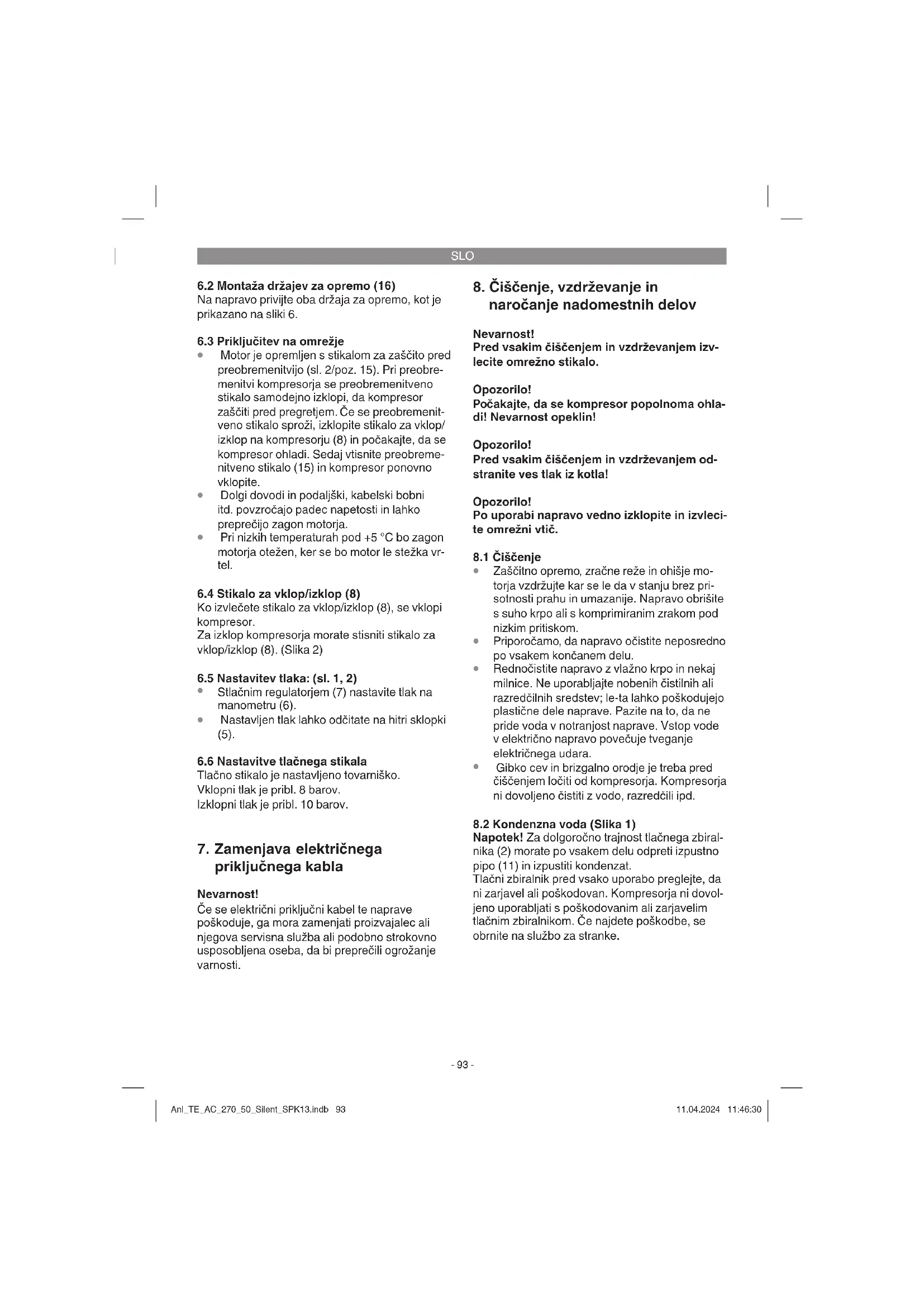 Napotec! Za dolgoročno trajnost tlacnega zbiral-nika (2) morate po vsakem delu odpreti izpustn opio (11) in izpustiti kondenzat.