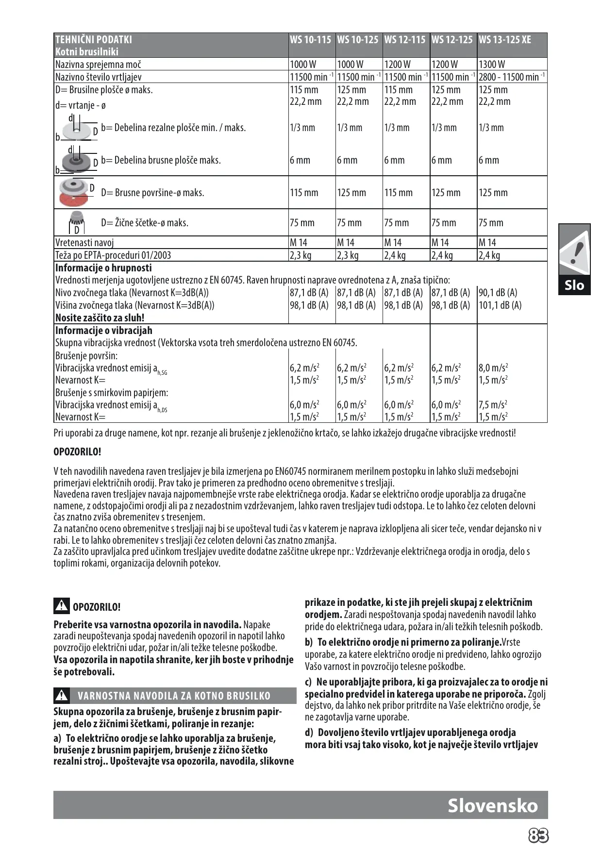 dejstvo, da lahko nek pribor pritrdite na Vaše električno orodje, še Skupna opozorila za brušenje, brušenje z brusnim papirne zagotavlja varne uporabe. jem, delo z žičnimi ščetkami, poliranje in rezanje: d) Dovoljeno število vrtljajev uporabljenega orodja a) To električno orodje se lahko uporablja za brušenje, mora biti vsaj tako visoko, kot je največje število vrtljajev brušenje z brusnim papirjem, brušenje z žično ščetko rezalni stroj.. Upoštevajte vsa opozorila, navodila, slikovne OPOZORILO! Slovensko