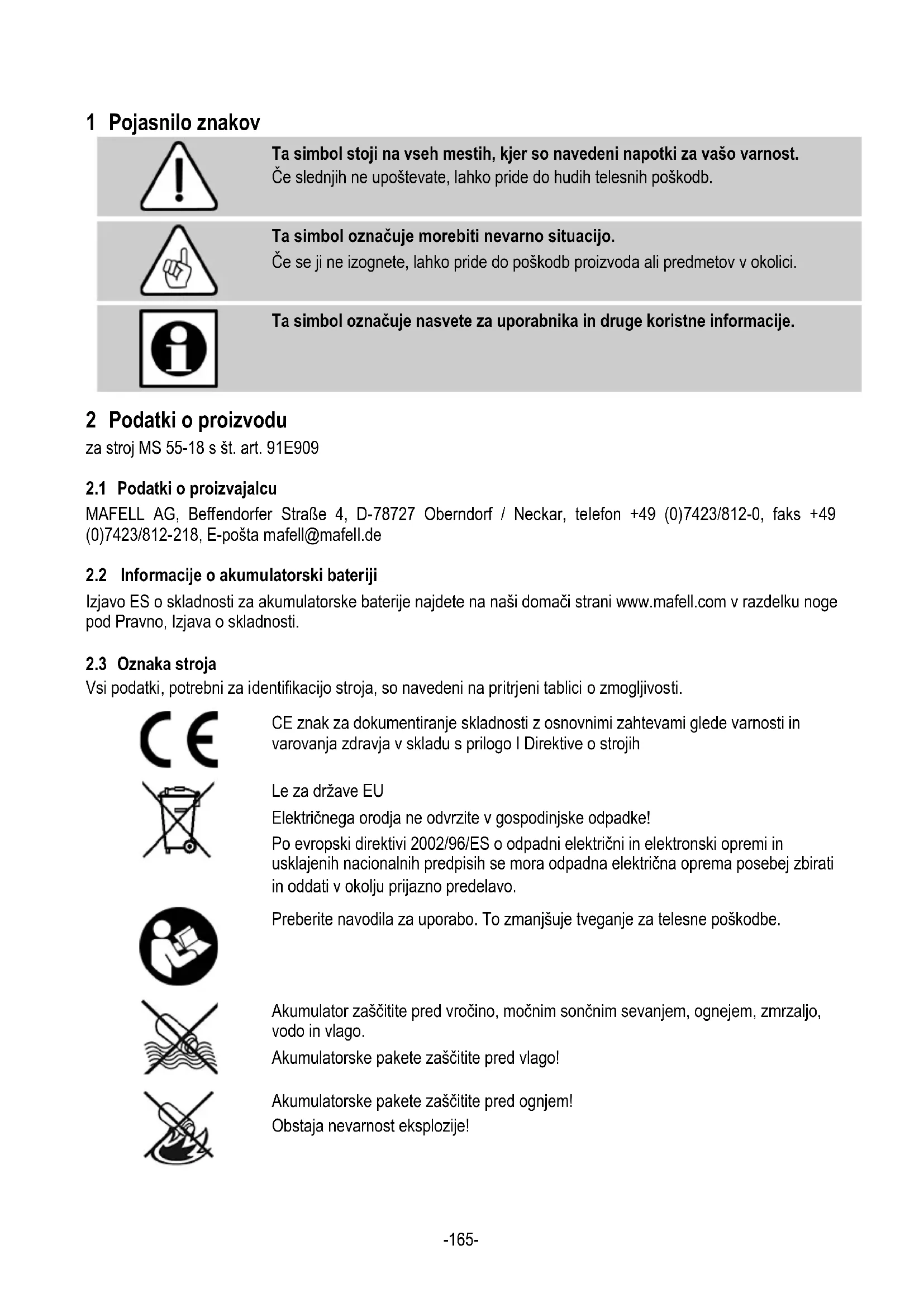 Ta simbol označuje nasvete za uporabnika in druge koristne informacije. 2 Podatki o proizvodu za stroj MS 55-18 s št. art. 91E909