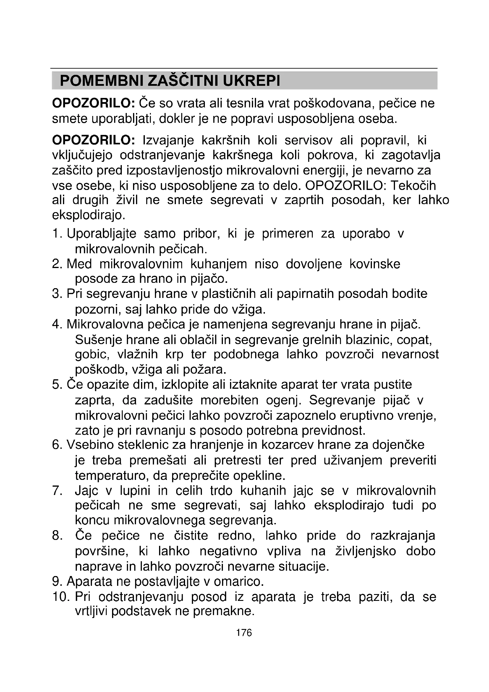 OPOZORILO: Če so vrata ali tesnila vrat poškodovana, pečice ne smete uporabljati, dokler je ne popravi usposobljena oseba. OPOZORILO: Izvajanje kakršnih koli servisov ali popravil, ki vključujejo odstranjevanje kakršnega koli pokrova, ki zagotavlja zaščito pred izpostavljenostjo mikrovalovni energiji, je nevarno za vse osebe, ki niso usposobljene za to delo. OPOZORILO: Tekočih ali drugih živil ne smete segrevati v zaprtih posodah, ker lahko eksplodirajo.