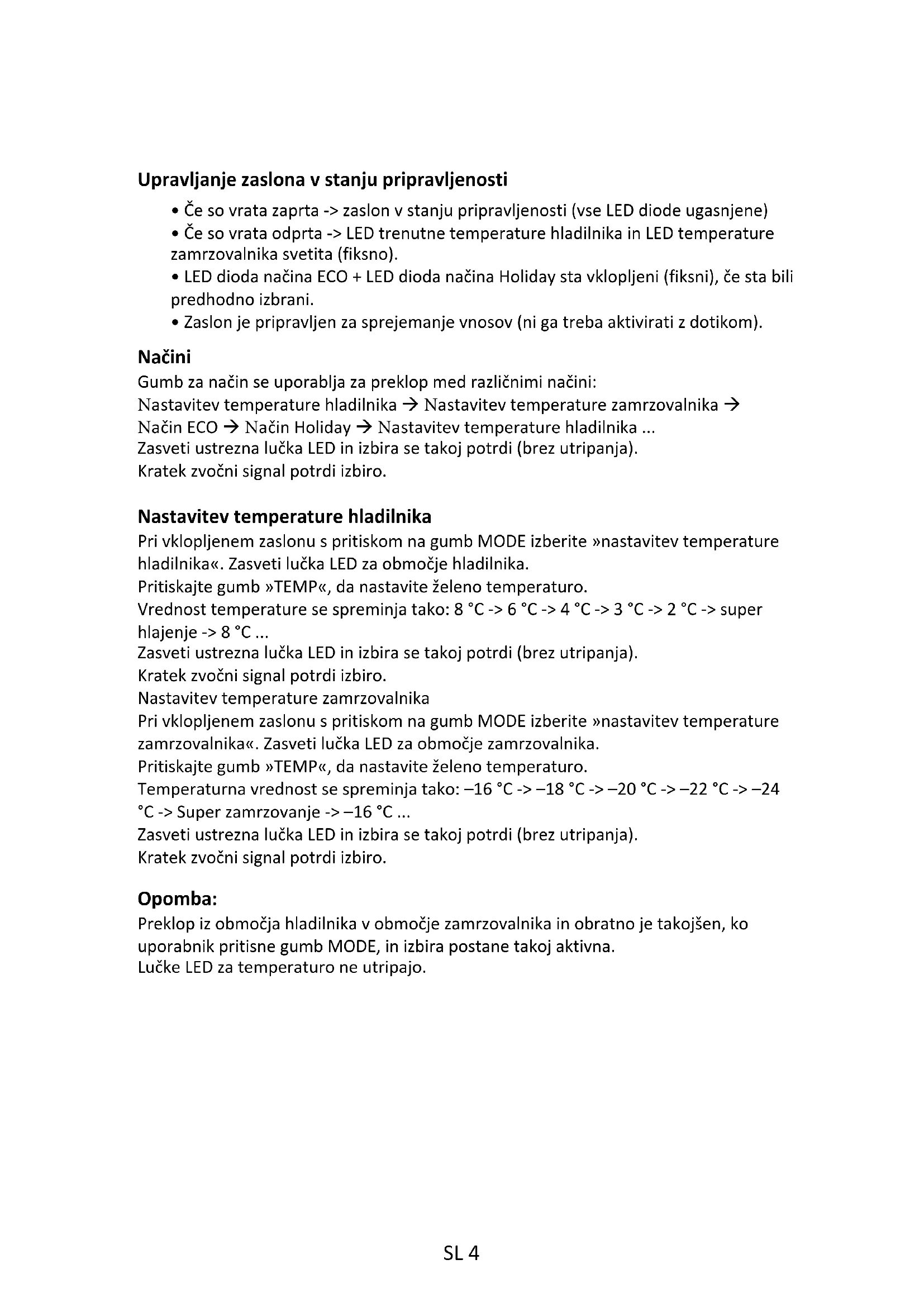 - Zaslon je pripravljen za sprejemanje vnosov (ni ga treba aktivirati z dotikom). Načini Gumb za način se uporablja za preklop med različnimi načini: Nastavitev temperature hladilnika Nastavitev temperature zamrzovalnika Način ECO Način Holiday Nastavitev temperature hladilnika ... Zasveti ustrezna lučka LED in izbira se takoj potrdi (brez utripanja). Kratek zvočni signal potrdi izbiro. Nastavitev temperature hladilnika Pri vklopljenem zaslonu s pritiskom na gumb MODE izberite »nastavitev temperature hladilnika«. Zasveti lučka LED za območje hladilnika. Pritiskajte gumb »TEMP«, da nastavite želeno temperaturo. Vrednost temperature se spreminja tako: 8 °C -> 6 °C -> 4 °C -> 3 °C -> 2 °C -> super hlajenje -> 8 °C ... Zasveti ustrezna lučka LED in izbira se takoj potrdi (brez utripanja). Kratek zvočni signal potrdi izbiro. Nastavitev temperature zamrzovalnika Pri vklopljenem zaslonu s pritiskom na gumb MODE izberite »nastavitev temperature zamrzovalnika«. Zasveti lučka LED za območje zamrzovalnika. Pritiskajte gumb »TEMP«, da nastavite želeno temperaturo. Temperaturna vrednost se spreminja tako: –16 °C -> –18 °C -> –20 °C -> –22 °C -> –24 °C -> Super zamrzovanje -> –16 °C ... Zasveti ustrezna lučka LED in izbira se takoj potrdi (brez utripanja). Kratek zvočni signal potrdi izbiro. Opomba: Preklop iz območja hladilnika v območje zamrzovalnika in obratno je takojšen, ko uporabnik pritisne gumb MODE, in izbira postane takoj aktivna. Lučke LED za temperaturo ne utripajo. SL 4Temperatura po meri V aplikaciji je mogoče prilagoditi temperaturo hladilnika in zamrzovalnika. Temperaturo lahko nastavite z občutljivostjo 1 °C. Temperaturo lahko izberete med 2 °C in 8 °C v hladilniku ter med -16 °C in -24 °C v zamrzovalniku. Ko aplikacija izbere temperaturo, se vklopi ikona prilagojene temperature, medtem ko so vse temperaturne LED lučke prizadetega predelka izklopljene (t.j. če je temperatura hladilnika izbrana iz aplikacije, se LED lučke od 2 °C do 8 °C izklopijo. Če izberete temperaturo zamrzovalnika iz aplikacije, se LED diode od -16 °C do -24 °C izklopijo). Če ima samo eno območje (zamrzovalnik ali hladilnik) prilagojeno temperaturo, se izbira temperature drugega območja ne spremeni in LED lučka izbrane temperature tega območja ostane vklopljena. Ob vsaki spremembi temperature se odda zvočni signal. Dolga zvočna povratna informacija (1 sekunda) potrjuje, da je povezava končana. Funkcija Super Cool Priporočamo, da funkcijo Super Cool vklopite, ko je treba shraniti večjo količino hrane (na primer po nakupu). Funkcija Super-Cool pospeši hlajenje sveže hrane in ščiti blago, ki je že shranjeno, pred neželenim segrevanjem. Ko je funkcija aktivirana, se temperatura hladilnika samodejno nastavi na 2°C. Kako uporabljati funkcijo Super Cool: