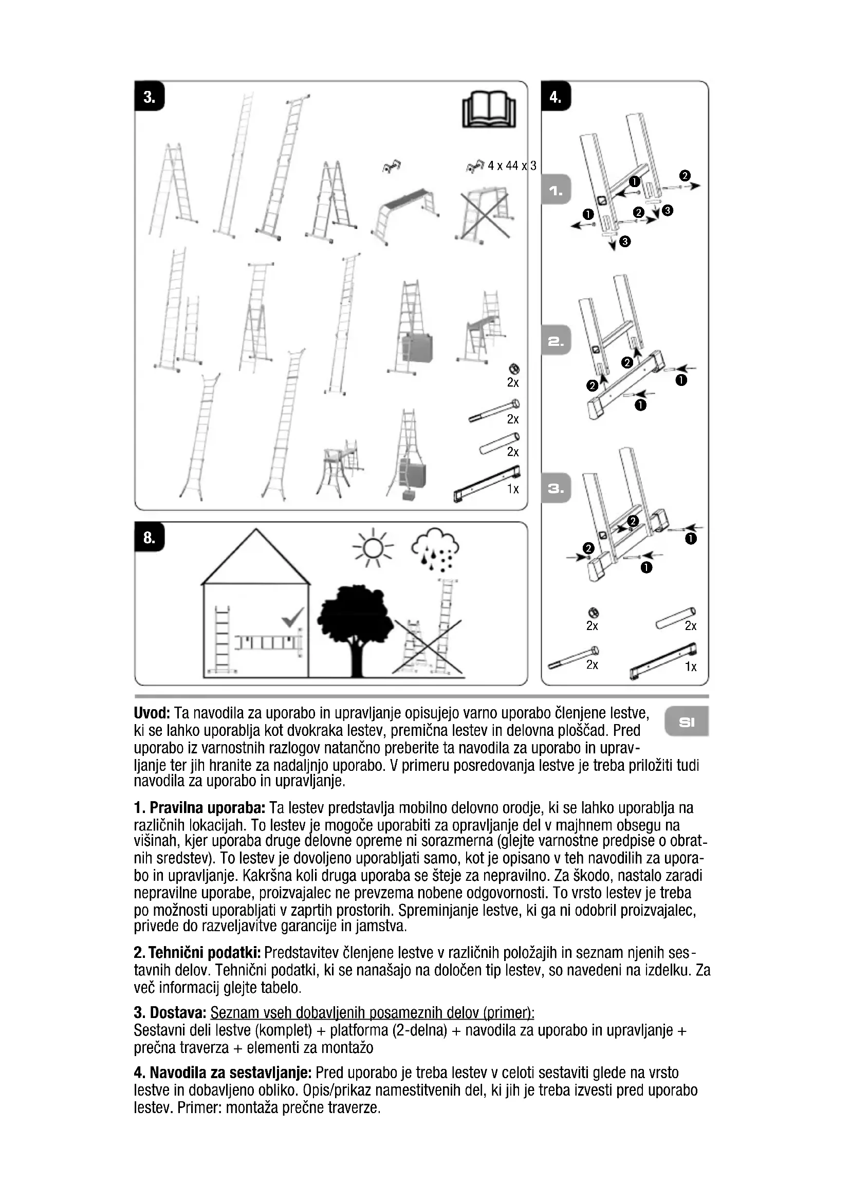 Uvod: Ta navodila za uporabo in upravljanje opisujejo varno uporabo členjene lestve, ki se lahko uporablja kot dvokraka lestev, premična lestev in delovna ploščad. Pred uporabo iz varnostnih razlogov natančno preberite ta navodila za uporabo in uprav