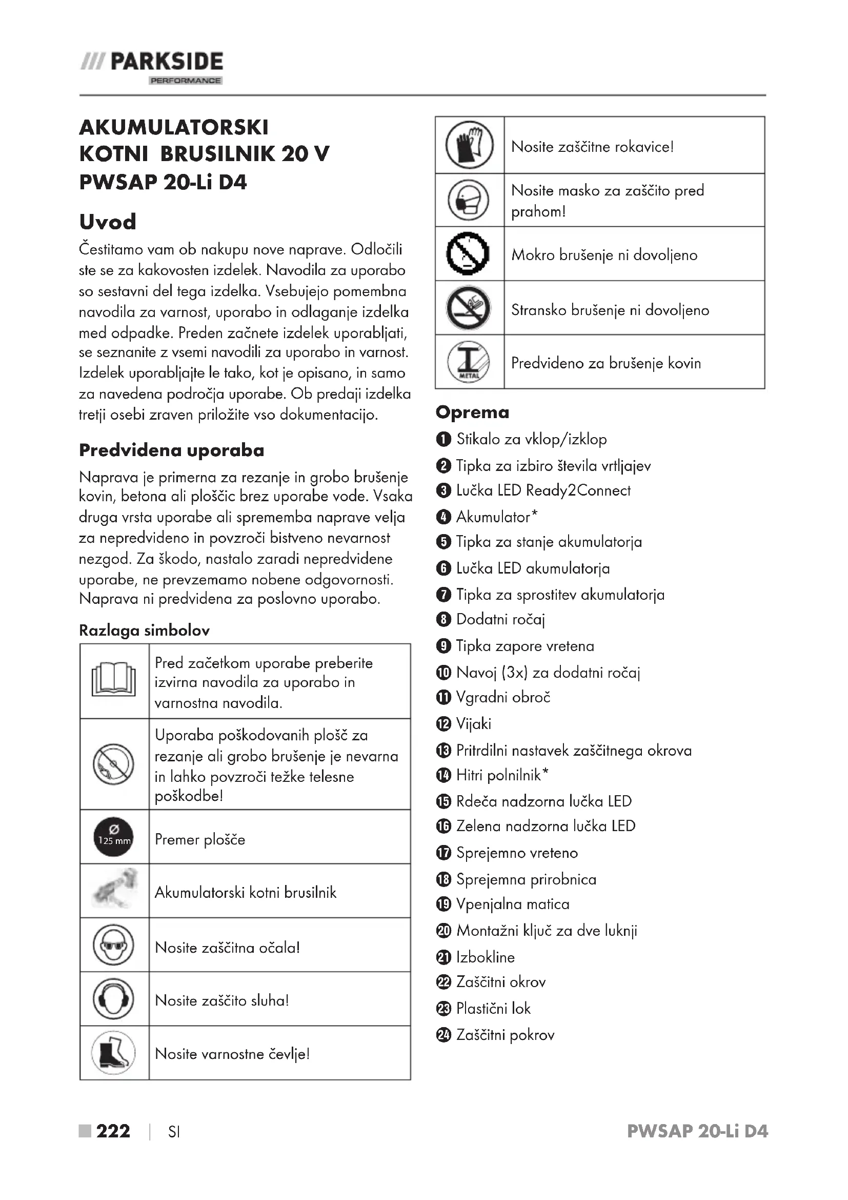 PWSAP 20-Li D4 Uvod Čestitamo vam ob nakupu nove naprave. Odločili ste se za kakovosten izdelek. Navodila za uporabo so sestavni del tega izdelka. Vsebujejo pomembna navodila za varnost, uporabo in odlaganje izdelka med odpadke. Preden začnete izdelek uporabljati, se seznanite z vsemi navodili za uporabo in varnost. Izdelek uporabljajte le tako, kot je opisano, in samo za navedena področja uporabe. Ob predaji izdelka tretji osebi zraven priložite vso dokumentacijo. Predvidena uporaba Naprava je primerna za rezanje in grobo brušenje kovin, betona ali ploščic brez uporabe vode. Vsaka druga vrsta uporabe ali sprememba naprave velja za nepredvideno in povzroči bistveno nevarnost nezgod. Za škodo, nastalo zaradi nepredvidene uporabe, ne prevzemamo nobene odgovornosti. Naprava ni predvidena za poslovno uporabo. Razlaga simbolov Pred začetkom uporabe preberite izvirna navodila za uporabo in varnostna navodila. Uporaba poškodovanih plošč za rezanje ali grobo brušenje je nevarna in lahko povzroči težke telesne poškodbe!