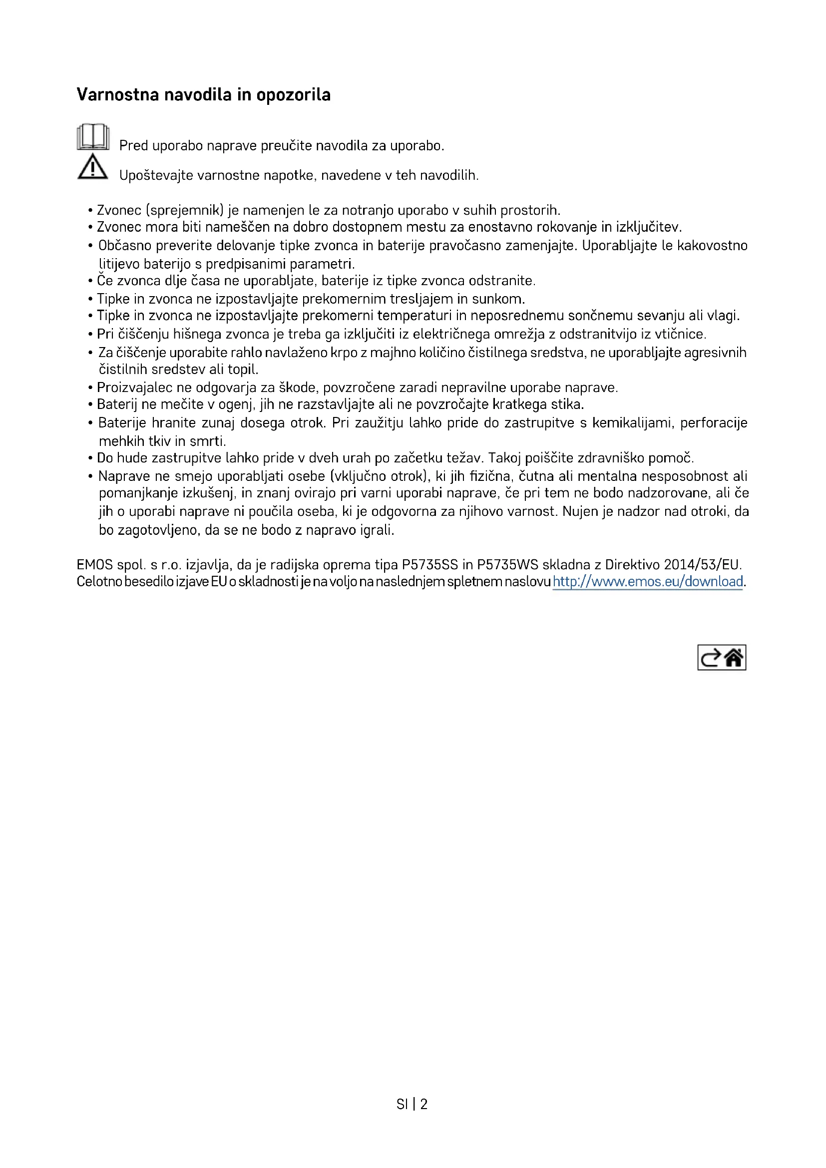 - Naprave ne smejo uporabljati osebe (vključno otrok), ki jih zična, čutna ali mentalna nesposobnost ali pomanjkanje izkušenj, in znanj ovirajo pri varni uporabi naprave, če pri tem ne bodo nadzorovane, ali če jih o uporabi naprave ni poučila oseba, ki je odgovorna za njihovo varnost. Nujen je nadzor nad otroki, da bo zagotovljeno, da se ne bodo z napravo igrali. EMOS spol. s r.o. izjavlja, da je radijska oprema tipa P5735SS in P5735WS skladna z Direktivo 2014/53/EU. Celotno besedilo izjave EU o skladnosti je na voljo na naslednjem spletnem naslovu http://www.emos.eu/download.SI | 3 80 mm 38 mm 19 mm 65 mm 80 mm 92 mm Tehnična specikacija Doseg oddajanja: do 150 m na prostem (v pozida- nem prostoru lahko pade vse na petino) Tipka: vodoodporna; zaščita IP44 Združevanje zvonca s tipkami: funkcija „self-learning“ Zmogljivost združevanja: največ 8 tipk na zvonec, največ 2 tipki na zvonec v aplikaciji EMOS GoSmart Število melodij: 52 Frekvenca prenosa: 433,92 MHz, 10 mW e.r.p. max. Napajanje zvonca: 230 V AC/50 Hz Napajanje tipke: baterija 1× 3 V (tip CR2032, priložena) Del seta: obojestranski lepilni trakSI | 4