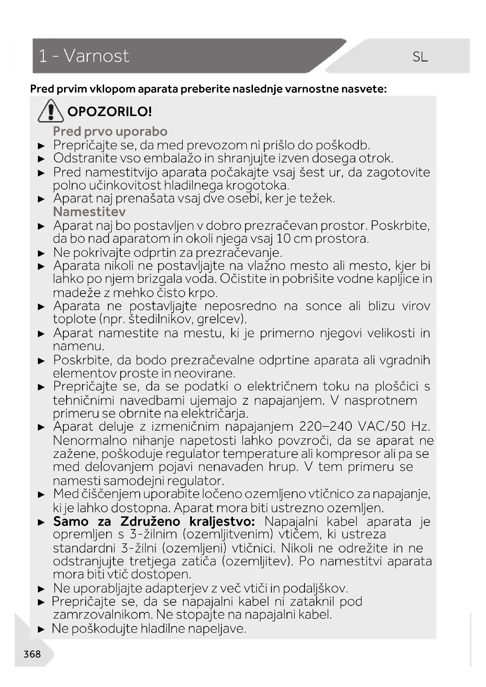 Pred prvim vklopom aparata preberite naslednje varnostne nasvete: OPOZORILO! Pred prvo uporabo ► Prepričajte se, da med prevozom ni prišlo do poškodb. ► Odstranite vso embalažo in shranjujte izven dosega otrok. ► Pred namestitvijo aparata počakajte vsaj šest ur, da zagotovite polno učinkovitost hladilnega krogotoka. ► Aparat naj prenašata vsaj dve osebi, ker je težek. Namestitev ► Aparat naj bo postavljen v dobro prezračevan prostor. Poskrbite, da bo nad aparatom in okoli njega vsaj 10 cm prostora. ► Ne pokrivajte odprtin za prezračevanje. ► Aparata nikoli ne postavljajte na vlažno mesto ali mesto, kjer bi lahko po njem brizgala voda. Očistite in pobrišite vodne kapljice in madeže z mehko čisto krpo. ► Aparata ne postavljajte neposredno na sonce ali blizu virov toplote (npr. štedilnikov, grelcev). ► Aparat namestite na mestu, ki je primerno njegovi velikosti in namenu. ► Poskrbite, da bodo prezračevalne odprtine aparata ali vgradnih elementov proste in neovirane. ► Prepričajte se, da se podatki o električnem toku na ploščici s tehničnimi navedbami ujemajo z napajanjem. V nasprotnem primeru se obrnite na električarja. ► Aparat deluje z izmeničnim napajanjem 220–240 VAC/50 Hz. Nenormalno nihanje napetosti lahko povzroči, da se aparat ne zažene, poškoduje regulator temperature ali kompresor ali pa se med delovanjem pojavi nenavaden hrup. V tem primeru se namesti samodejni regulator. ► Med čiščenjem uporabite ločeno ozemljeno vtičnico za napajanje, ki je lahko dostopna. Aparat mora biti ustrezno ozemljen. ► Samo za Združeno kraljestvo: Napajalni kabel aparata je opremljen s 3-žilnim (ozemljitvenim) vtičem, ki ustreza standardni 3-žilni (ozemljeni) vtičnici. Nikoli ne odrežite in ne odstranjujte tretjega zatiča (ozemljitev). Po namestitvi aparata mora biti vtič dostopen. ► Ne uporabljajte adapterjev z več vtiči in podaljškov. ► Prepričajte se, da se napajalni kabel ni zataknil pod zamrzovalnikom. Ne stopajte na napajalni kabel. ► Ne poškodujte hladilne napeljave.SL