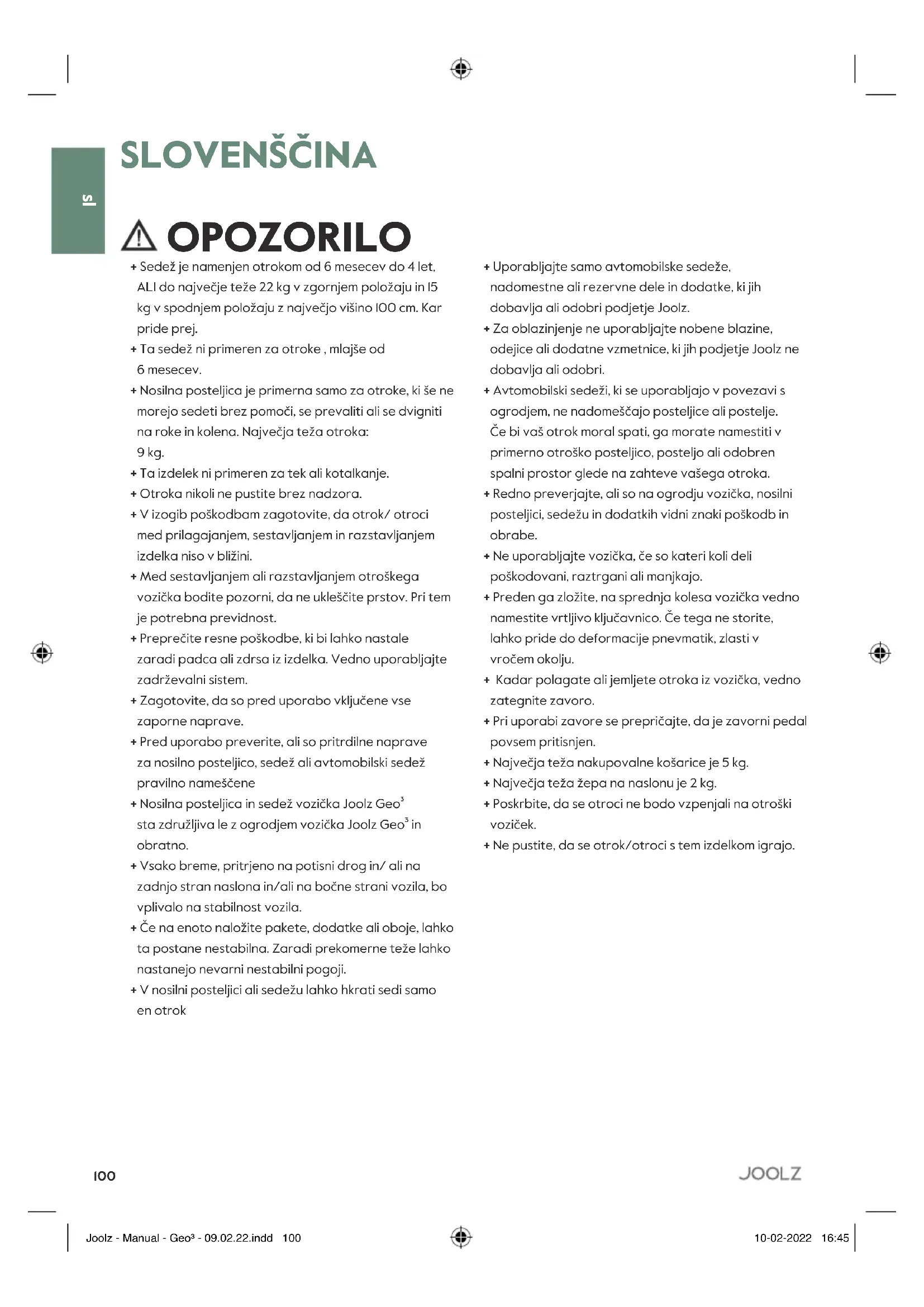 sausumos transportu. Kuriant „Joolz Geo³“ buvo itin atsižvelgiama į saugumą. Todėl mūsų gaminiai atitinka šiuos saugos standartus: Europe: EN1888-2:2018 & EN 1466:2014/AC:2015 United States: ASTM F833-21, ASTM F2050-19 Canada: SOR/2016-167 Australia: AS/NZS 2088:2013 Aplankykite joolz.com, facebook.com/myjoolz arba susisiekite su pardavėju, jei turite klausimų ir (arba) pastabų. Joolz - Manual - Geo³ - 09.02.22.indd 99Joolz - Manual - Geo³ - 09.02.22.indd 99 10-02-2022 16:4510-02-2022 16:45100 SLOVENŠČINA OPOZORILO + Sedež je namenjen otrokom od 6 mesecev do 4 let, ALI do največje teže 22 kg v zgornjem položaju in 15 kg v spodnjem položaju z največjo višino 100 cm. Kar pride prej. + Ta sedež ni primeren za otroke , mlajše od 6 mesecev. + Nosilna posteljica je primerna samo za otroke, ki še ne morejo sedeti brez pomoči, se prevaliti ali se dvigniti na roke in kolena. Največja teža otroka: 9 kg. + Ta izdelek ni primeren za tek ali kotalkanje. + Otroka nikoli ne pustite brez nadzora. + V izogib poškodbam zagotovite, da otrok/ otroci med prilagajanjem, sestavljanjem in razstavljanjem izdelka niso v bližini. + Med sestavljanjem ali razstavljanjem otroškega vozička bodite pozorni, da ne ukleščite prstov. Pri tem je potrebna previdnost. + Preprečite resne poškodbe, ki bi lahko nastale zaradi padca ali zdrsa iz izdelka. Vedno uporabljajte zadrževalni sistem. + Zagotovite, da so pred uporabo vključene vse zaporne naprave. + Pred uporabo preverite, ali so pritrdilne naprave za nosilno posteljico, sedež ali avtomobilski sedež pravilno nameščene + Nosilna posteljica in sedež vozička Joolz Geo³ sta združljiva le z ogrodjem vozička Joolz Geo³ in obratno. + Vsako breme, pritrjeno na potisni drog in/ ali na zadnjo stran naslona in/ali na bočne strani vozila, bo vplivalo na stabilnost vozila. + Če na enoto naložite pakete, dodatke ali oboje, lahko ta postane nestabilna. Zaradi prekomerne teže lahko nastanejo nevarni nestabilni pogoji. + V nosilni posteljici ali sedežu lahko hkrati sedi samo en otrok + Uporabljajte samo avtomobilske sedeže, nadomestne ali rezervne dele in dodatke, ki jih dobavlja ali odobri podjetje Joolz. + Za oblazinjenje ne uporabljajte nobene blazine, odejice ali dodatne vzmetnice, ki jih podjetje Joolz ne dobavlja ali odobri. + Avtomobilski sedeži, ki se uporabljajo v povezavi s ogrodjem, ne nadomeščajo posteljice ali postelje. Če bi vaš otrok moral spati, ga morate namestiti v primerno otroško posteljico, posteljo ali odobren spalni prostor glede na zahteve vašega otroka. + Redno preverjajte, ali so na ogrodju vozička, nosilni posteljici, sedežu in dodatkih vidni znaki poškodb in obrabe. + Ne uporabljajte vozička, če so kateri koli deli poškodovani, raztrgani ali manjkajo. + Preden ga zložite, na sprednja kolesa vozička vedno namestite vrtljivo ključavnico. Če tega ne storite, lahko pride do deformacije pnevmatik, zlasti v vročem okolju. + Kadar polagate ali jemljete otroka iz vozička, vedno zategnite zavoro. + Pri uporabi zavore se prepričajte, da je zavorni pedal povsem pritisnjen. + Največja teža nakupovalne košarice je 5 kg. + Največja teža žepa na naslonu je 2 kg. + Poskrbite, da se otroci ne bodo vzpenjali na otroški voziček. + Ne pustite, da se otrok/otroci s tem izdelkom igrajo.