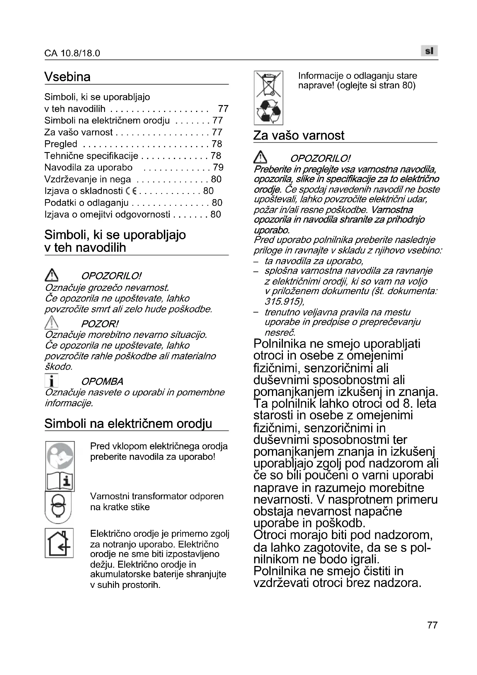 - Izjava o omejitvi odgovornosti Simboli, ki se uporabljajo v teh navodilih OPOZORILO! Označuje grozečo nevarnost. Če opozorila ne upoštevate, lahko povzročite smrt ali zelo hude poškodbe. POZOR! Označuje morebitno nevarno situacijo. Če opozorila ne upoštevate, lahko povzročite rahle poškodbe ali materialno škodo. OPOMBA Označuje nasvete o uporabi in pomembne informacije. Simboli na električnem orodju Pred vklopom električnega orodja preberite navodila za uporabo! Varnostni transformator odporen na kratke stike Električno orodje je primerno zgolj za notranjo uporabo. Električno orodje ne sme biti izpostavljeno dežju. Električno orodje in akumulatorske baterije shranjujte v suhih prostorih. Informacije o odlaganju stare naprave! (oglejte si stran 80) Za vašo varnost OPOZORILO! Preberite in preglejte vsa varnostna navodila, opozorila, slike in specifikacije za to električno orodje. Če spodaj navedenih navodil ne boste upoštevali, lahko povzročite električni udar, požar in/ali resne poškodbe. Varnostna opozorila in navodila shranite za prihodnjo uporabo. Pred uporabo polnilnika preberite naslednje priloge in ravnajte v skladu z njihovo vsebino: p. 80
