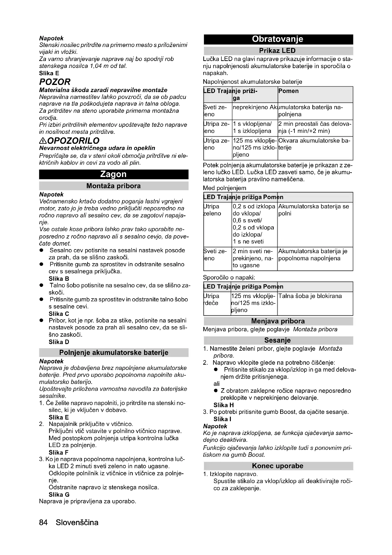 - Kmitočet Hz 50 - 60 Doba nabíjení při úplném vybití baterie min 390 Třída krytí II Výkonnostní údaje přístroje Obsah nádrže l 0,65 Provozní časy s plným nabitím akumulátoru za běžného provozu min 30 Provozní časy s plným nabitím akumulátoru za maximálního provozu min 18 Rozměry a hmotnosti Hmotnost (bez příslušenství) kg 1,55Slovenščina 83 Kazalo Splošna navodila Pred prvo uporabo naprave preberite ta originalna navodila za uporabo in prilo- žena varnostna navodila ter jih upošte- vajte. Obe knjižici shranite za poznejšo uporabo ali za nasled- njega uporabnika. Namenska uporaba ● Napravo uporabljajte izključno v zasebnem gospo- dinjstvu. ● Naprava je namenjena izključno čiščenju suhih po- vršin ● Za nenamensko uporabo velja: – Sesanje ljudi, živali, rastlin ali oblačil, ki jih imate na sebi. – Sesanje vode ali drugih tekočin. – Sesanje žarečega pepela, premoga, cigaret ali dru gih vnetljivih ali lahko vnetljivih snovi. – Uporaba v bližini eksplozivnih ali lahko vnetljivih snovi. Varovanje okolja Materiali embalaže se lahko reciklirajo. Embalažo odstranite na okolju varen način. Električne in elektronske naprave vsebujejo dra- gocene materiale z možnostjo recikliranja, pogos- to pa tudi sestavne dele, kot so baterije, akumulatorske baterije ali olja, ki lahko pri napač- ni uporabi ali napačnem odstranjevanju škodujejo zdravju ljudi in okolju. Navedeni sestavni deli so kljub te- mu potrebni za pravilno delovanje naprave. Naprave, označene s tem simbolom, ne smete odvreči med go- spodinjske odpadke. Napotki o sestavinah (REACH) Aktualne informacije najdete na spletnem naslovu: www.kaercher.com/REACH Pribor in nadomestni deli Uporabljajte samo originalni pribor in originalne nado- mestne dele, ki zagotavljajo varno in nemoteno delova- nje naprave. Informacije o priboru in nadomestnih delih najdete na spletnem naslovu www.kaercher.com. Garancija V vsaki državi veljajo garancijski pogoji, ki jih je izdala naša pristojna prodajna družba. V garancijskem roku bodo morebitne motnje v delovanju naprave odpravlje- ne brezplačno, če je njihov vzrok napaka v materialu ali napaka pri proizvodnji. Pri uveljavljenju garancije zago- tovite dokazilo o nakupu in stopite v stik s prodajalcem ali z najbližjo servisno službo. Naslov najdete na hrbtni strani. Obseg dobave Obseg dobave je upodobljen na embalaži. Pri odstra- njevanju embalaže preverite, ali je vsebina popolna. Če manjka pribor ali če so med transportom nastale po- škodbe, obvestite prodajalca. Opis naprave Oprema se razlikuje glede na izbrani model. Konkretna oprema je opisana na embalaži naprave. Glejte slike na strani s slikami. Slika A 1 Kontrolna lučka LED akumulatorska baterija/sporo- čilo o napaki 2 Sprostite gumbe za odstranjevanje penastega filtra izstopnega zraka 3 Pokrov penastega filtra izstopnega zraka 4 Gumb za funkcijo Boost (povečanje sesalne moči) 5 Stikalo za vklop/izklop s fiksirno ročico 6 Ročaj 7 Zamenljiva akumulatorska baterija 8 Gumb za sprostitev akumulatorske baterije 9 Gumb za odklepanje za odstranjevanje posode za prah 10 Filter vstopnega zraka 11 Pokrov posode za prah 12 Odstranljiva posoda za prah 13 Gumb za sprostitev pokrova posode za prah 14 Sesalni nastavek posode za prah 15 Motorna električna krtača z univerzalnim krtačnim valjem 16 Sesalna gibka cev 17 Šoba za stike 18 Kombinirana krtača 2 v 1 19 Stenski nosilec 20 Polnilnik 21 ** Filter vstopnega zraka (2x) 22 ** Orodje za čiščenje filtra ** VC 4 Cordless Premium myHome Nameščanje stenskega nosilca Obseg dobave vključuje stenski nosilec ter vijake in vložke za urejeno shranjevanje sesalnika. Splošna navodila p. 83