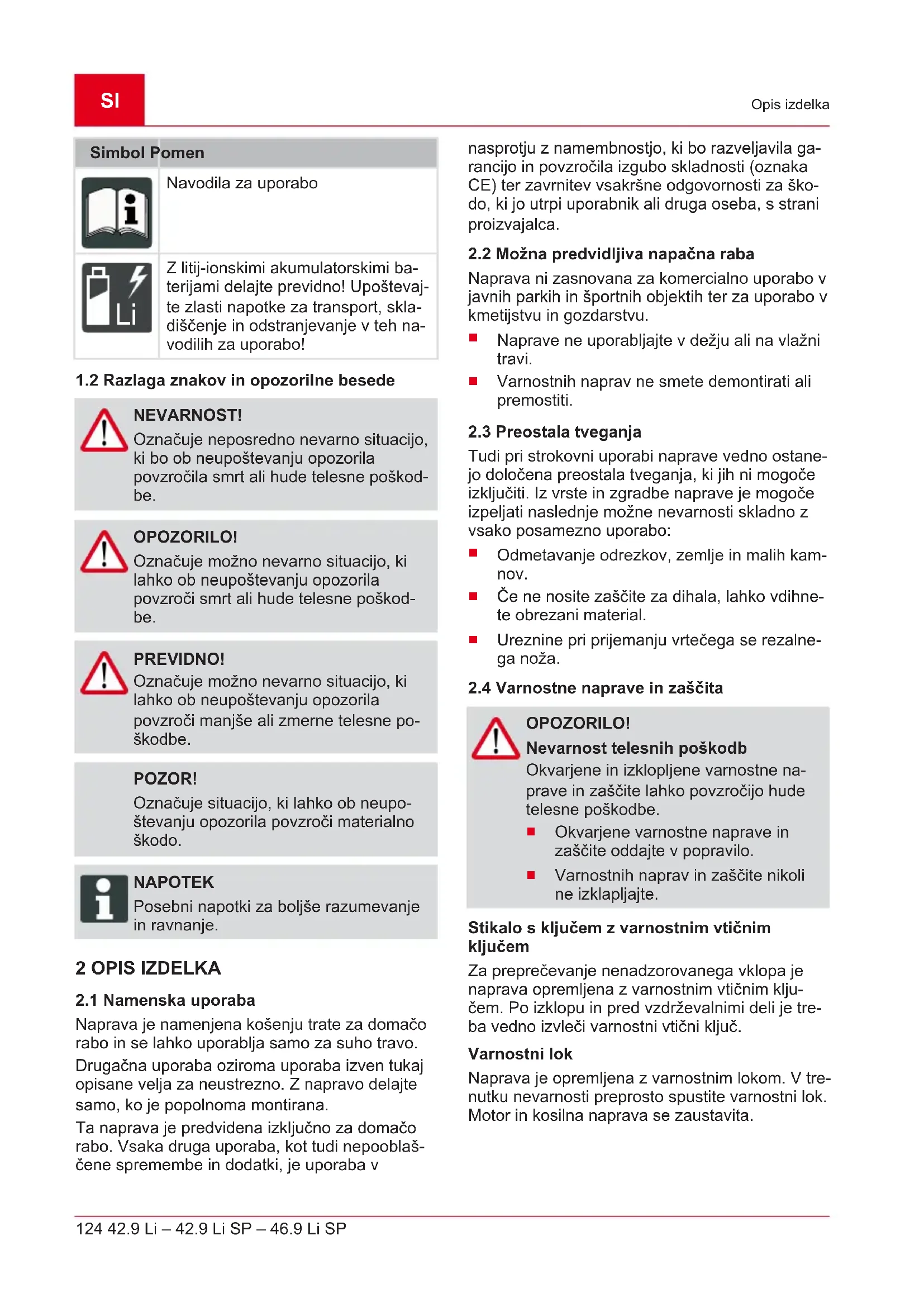 - Samo pri 42.9 Li SP in 46.9 Li SP. ** Odvisno od številke artikla, glejte tehnične po- datke. *** Za 46.9 Li SP na voljo kot pribor. 3 VARNOSTNI NAPOTKI NEVARNOST! Smrtna nevarnost in nevarnost hudih telesnih poškodb! Nepoznavanje varnostnih napotkov in navodil za upravljanje lahko povzroči ze- lo hude telesne poškodbe in posledično smrt.