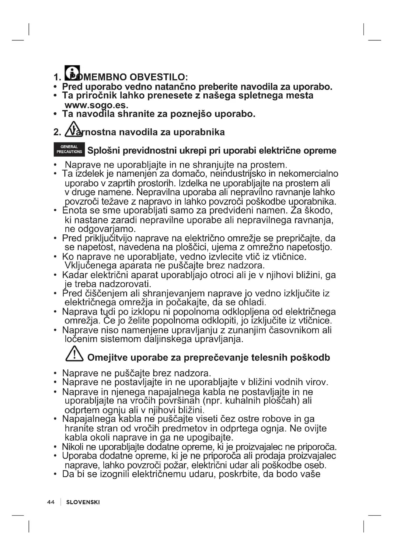 GENERAL PRECAUTIONS Splošni previdnostni ukrepi pri uporabi električne opreme