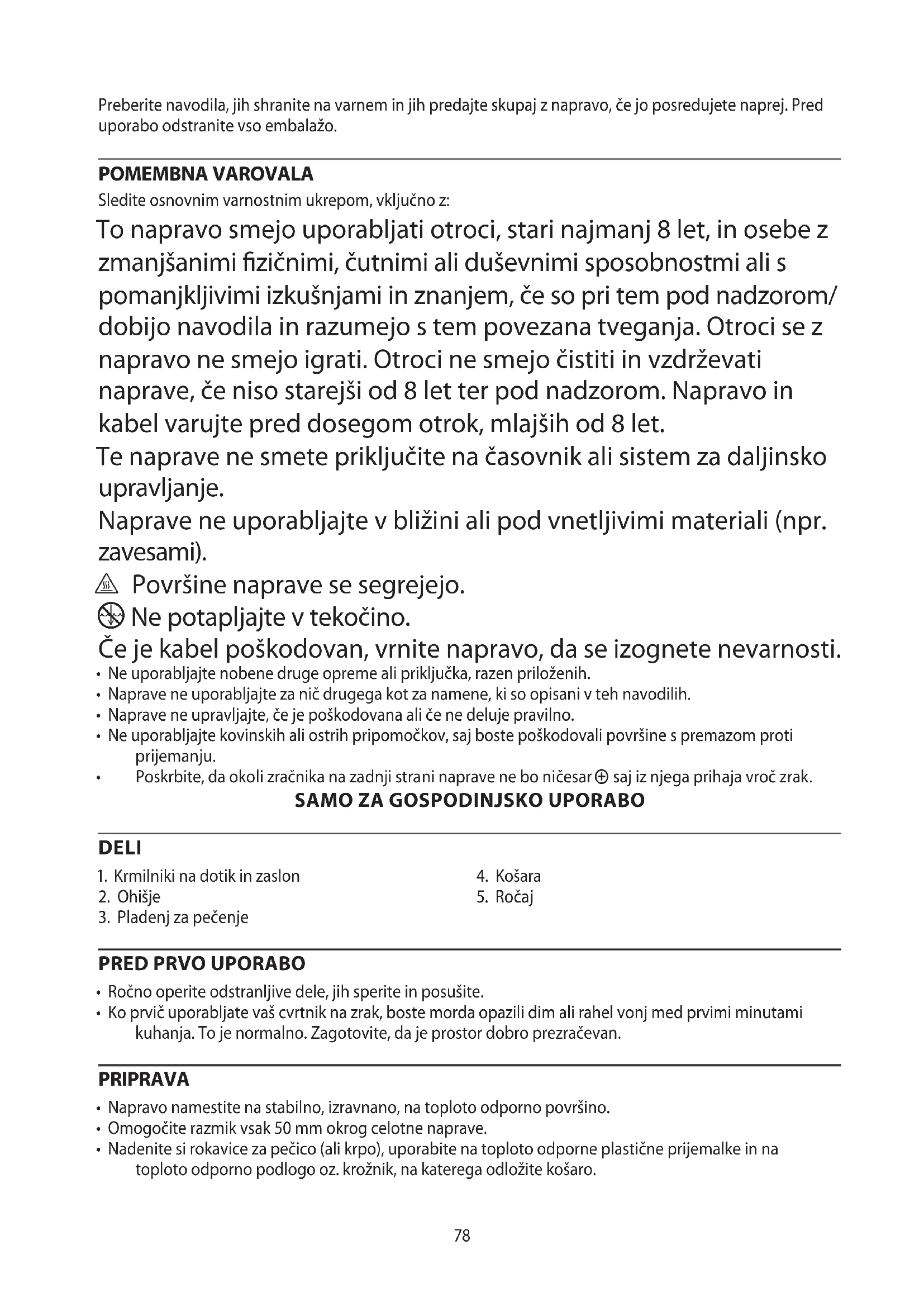 AE78 Preberite navodila, jih shranite na varnem in jih predajte skupaj z napravo, če jo posredujete naprej. Pred uporabo odstranite vso embalažo. POMEMBNA VAROVALA Sledite osnovnim varnostnim ukrepom, vključno z: To napravo smejo uporabljati otroci, stari najmanj 8 let, in osebe z zmanjšanimi fizičnimi, čutnimi ali duševnimi sposobnostmi ali s pomanjkljivimi izkušnjami in znanjem, če so pri tem pod nadzorom/ dobijo navodila in razumejo s tem povezana tveganja. Otroci se z napravo ne smejo igrati. Otroci ne smejo čistiti in vzdrževati naprave, če niso starejši od 8 let ter pod nadzorom. Napravo in kabel varujte pred dosegom otrok, mlajših od 8 let. Te naprave ne smete priključite na časovnik ali sistem za daljinsko upravljanje. Naprave ne uporabljajte v bližini ali pod vnetljivimi materiali (npr. zavesami). ¬ Površine naprave se segrejejo. i Ne potapljajte v tekočino. Če je kabel poškodovan, vrnite napravo, da se izognete nevarnosti.
