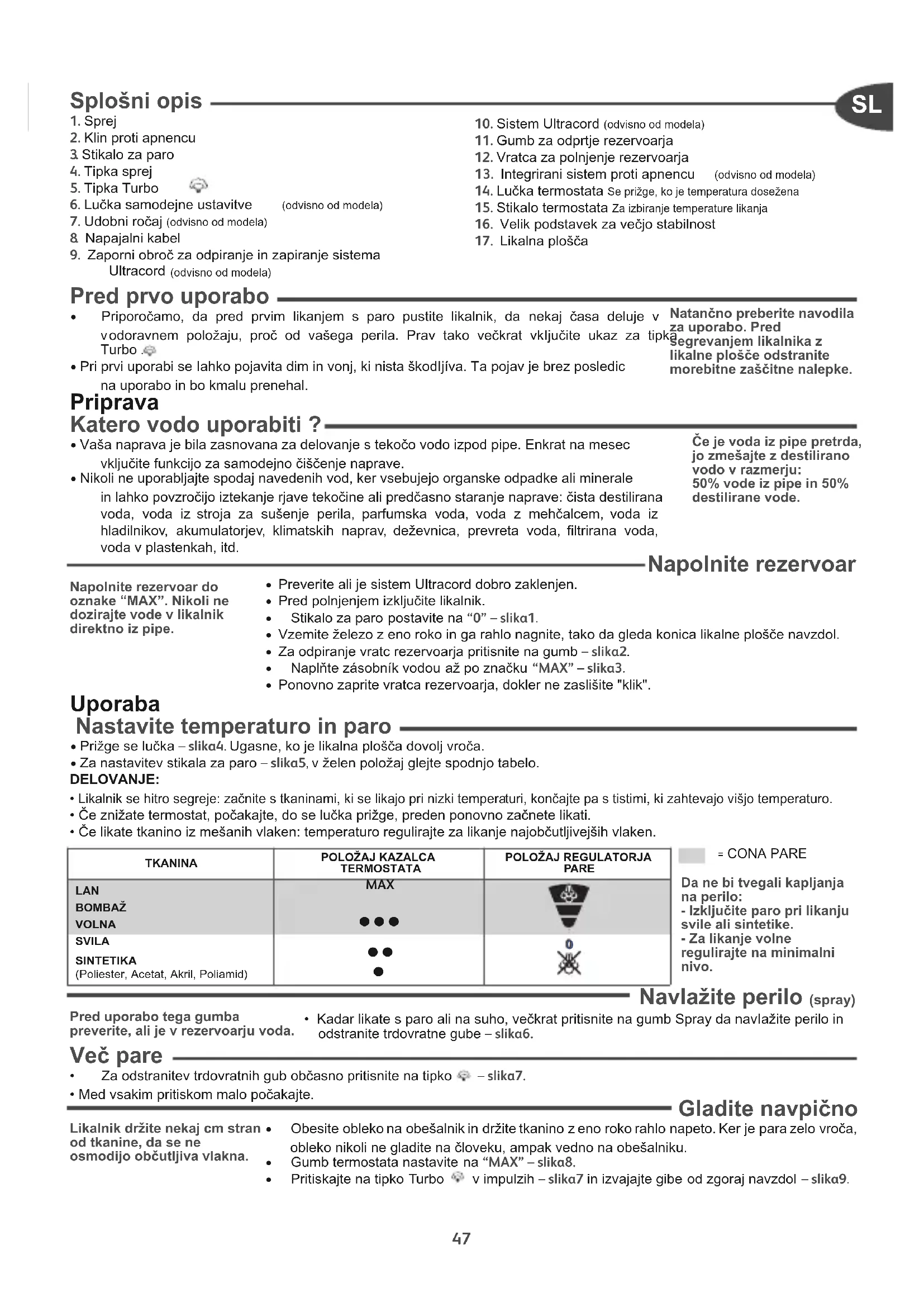 Sodelujmo pri varovanju okolja ! Vaš aparat vsebuje številne dele, ki imajo svojo vrednost ali jih še mogoče uprabiti. Oddajte ga na mestu za zbiranje odpadkov ali pa na pooblaščenem servisu, da bo šel v predelavo. Za udobnejše delo vedno uporabljajte sistem Ultracord. Pozor ! - Nikoli ne primite za konec klina! - Likalnik ne deluje brez klina proti apnencu. Ne uporabljajte agresivnih ali abrazivnih sredstev. 1800132818 FV52XX E0 A11_110 x 154 24/03/14 10:47 Page49Pre prve upotrebe